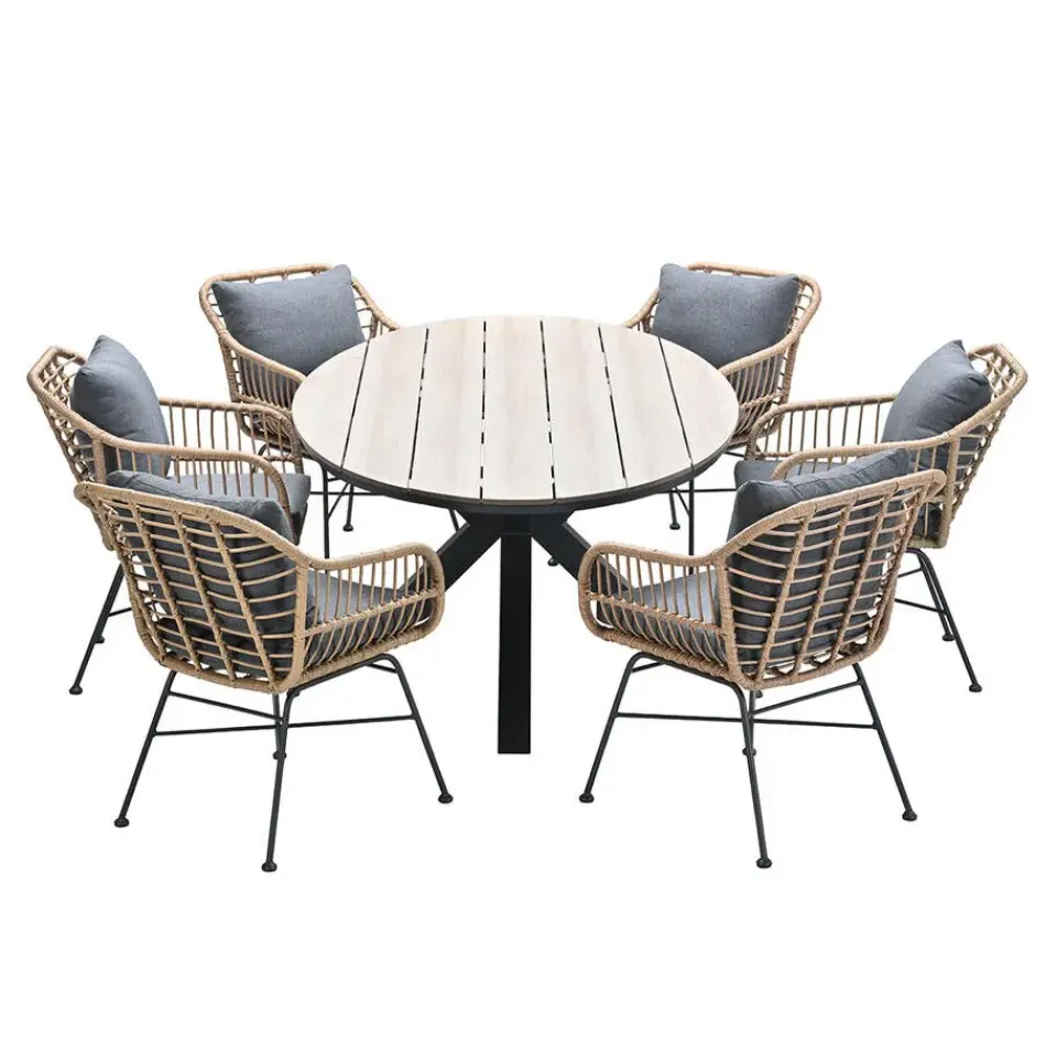 De Tulli tuintafel is een aluminium tuintafel met hout kleurig vironwood. De Lucas dining fauteuil is vervaardigd uit een onderhoudsvrij aluminium frame met daaromheen hoogwaardige kwaliteit natural kleurig vlechtwerkdraad. Deze combinatie zorgt gegarandeerd voor een kwalitatief hoogwaardige dining fauteuil. De poten van de relax fauteuil zijn gemaakt van e-coated staal. Dit is een stevige coating die via elektronisch geladen verfdeeltjes is aangebracht.