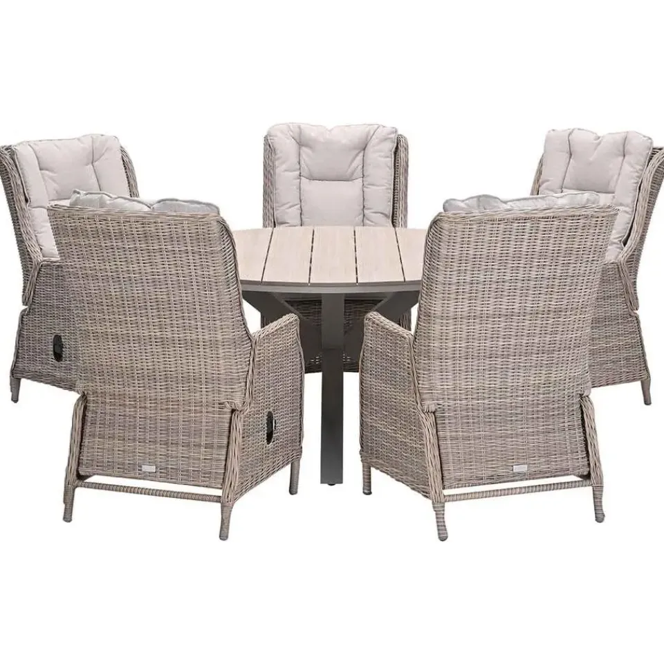 De tuinstoel heeft een afmeting van 62 bij 80 cm en is 105 cm. De tuinstoel heeft een hoge rugleuning ideaal voor wanneer je wat langer bent. De ronde tuintafel heeft een doorsnede van 148 cm en is 75 cm hoog. De hoogte tot de onderkant van het tafelblad is 69,5 cm. Het tafelblad heeft een prachtige houtlook uitstraling.