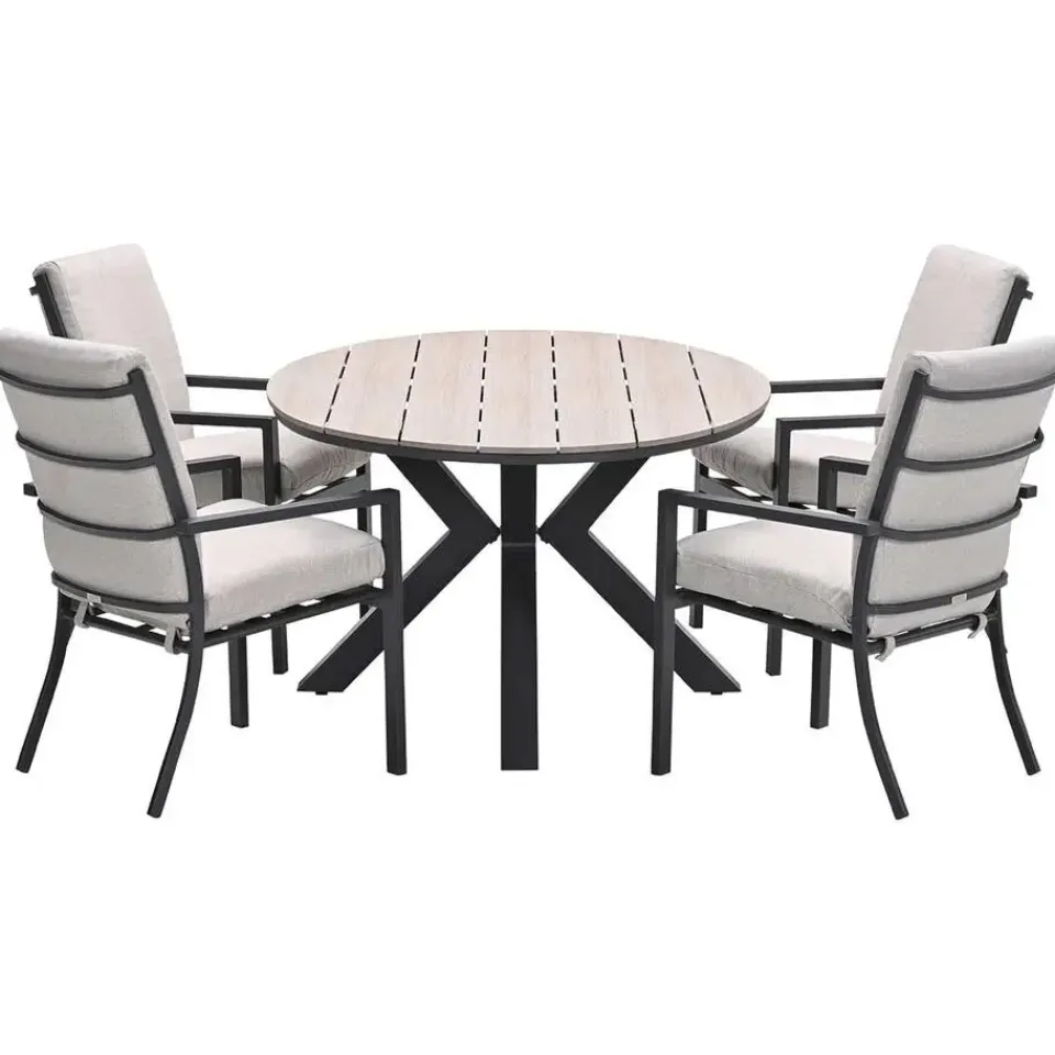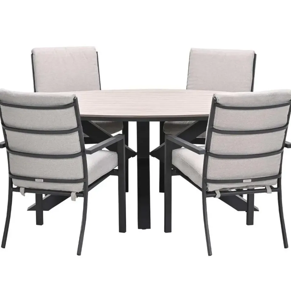 De Tulli tuintafel heeft een frame dat gemaakt is van aluminium en is voorzien van een stevige poeder coating laag. Het frame is fraai vormgegeven door de kruis tafelpoten die schuin onder de tuintafel zijn geplaatst, hierdoor krijgt de tuintafel een speciaal en uniek uiterlijk. Het tafelblad is gemaakt van Vironwood latten, dit is een onderhoudsvriendelijke kunststof met een mooie houtuitstraling. Let wel op voor scherpe voorwerpen en vector vorming anders heb je zo krassen of smeltpuntjes in het Vironwood.