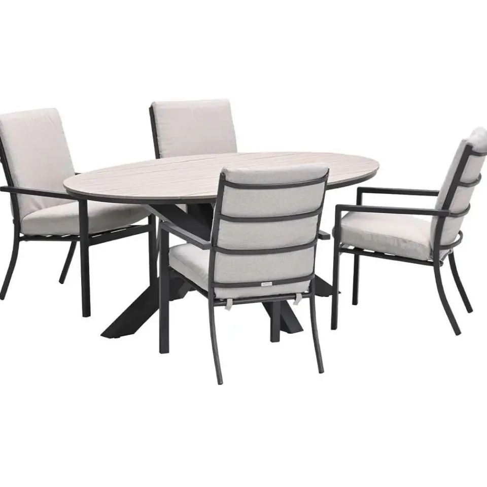 De Senja lounge dining stoel heeft een afmeting van 60 bij 72,5 cm en is 93 cm hoog. De ovale tuintafel heeft een afmeting van 180 bij 115 cm en is 75 cm hoog. De hoogte tot de onderkant van het tafelblad is 69,5 cm.