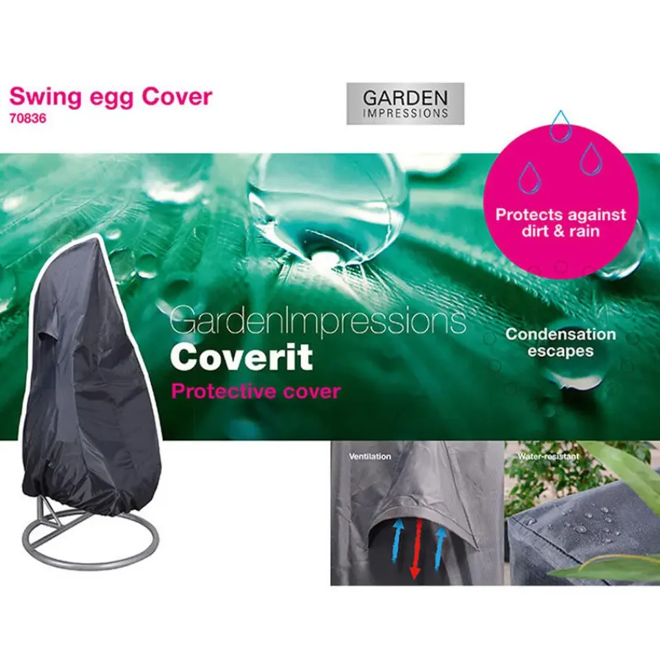 Ben je op zoek naar een beschermhoes voor jouw Swing egg? Deze prettige beschermhoes van kwaliteitsmerk Garden Impressions zorgt ervoor dat je langer plezier zal hebben van jouw tuinmeubelen. Om de levensduur van je tuinmeubelen te verlengen, raden wij aan om deze af te dekken in de wintermaanden. De beschermhoezen van Garden Impressions zijn gemaakt van PVC met een ademende coating. Deze coating zorgt ervoor dat hoes waterbestendig is. De hoes is niet volledig waterdicht, maar waterafstotend. Het is een flexibele ademende coating, waardoor de hoes in de wintermaanden ook nog flexibel blijft. Doordat de hoes niet volledig waterdicht is, is aan te raden om een afstand te creëren tussen het tuinmeubel en de hoes. Het water kan er dan gemakkelijker afstromen en het tuinmeubel kan niet verstikken. De beschermhoes is voorzien van ventilatie driehoeken zodat het tuinmeubel kan ademen. De hoes kan gemakkelijk om de Swing egg worden bevestigd. Op alle hoeken zit onderaan een elastieken band om de hoes strak te houden. We raden je aan om de kussen niet onder de hoes te laten liggen. Mocht de kussens al nat zijn geworden, is dat niet erg maar zorg er wel voor dat ze droog worden opgeborgen. Beschermhoes voor de Swing Egg met afmeting Ø100xH200 cm.