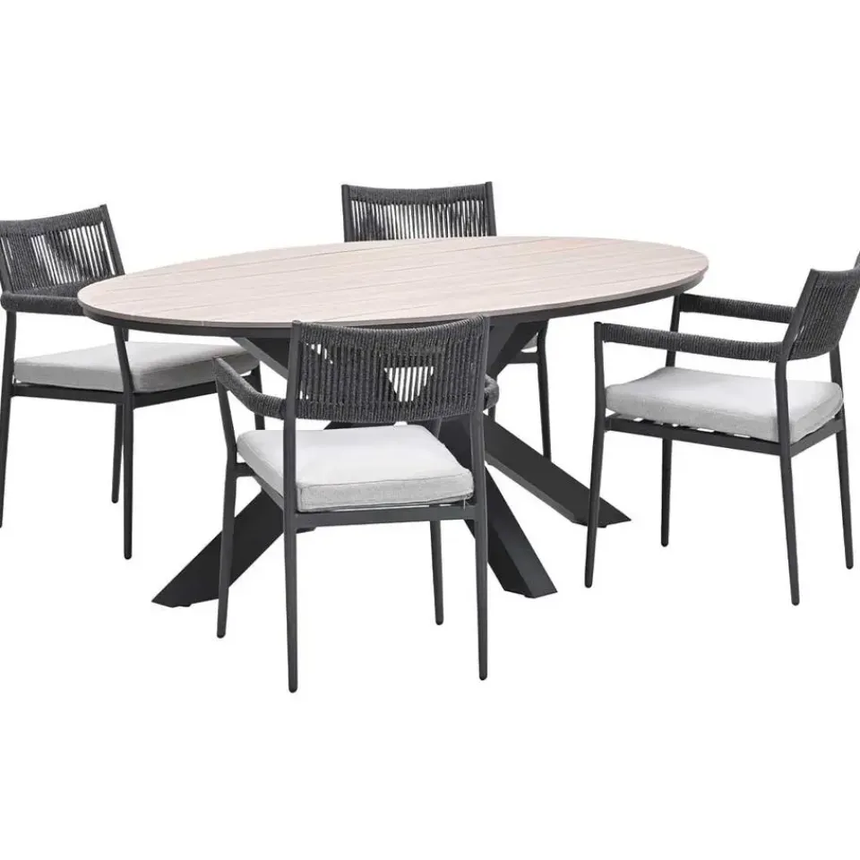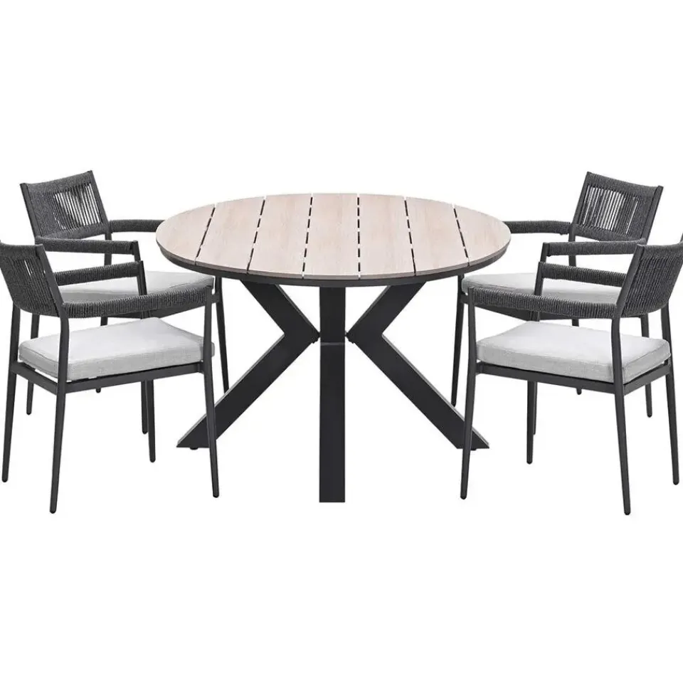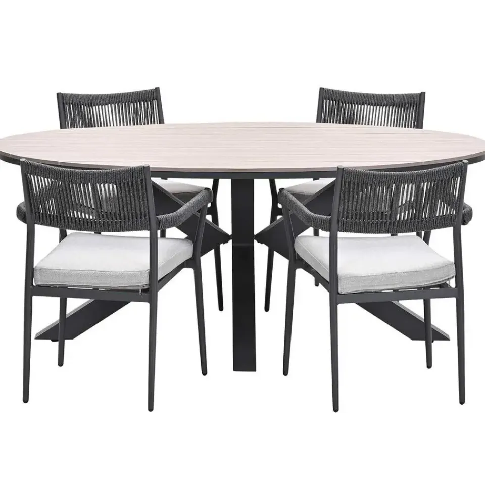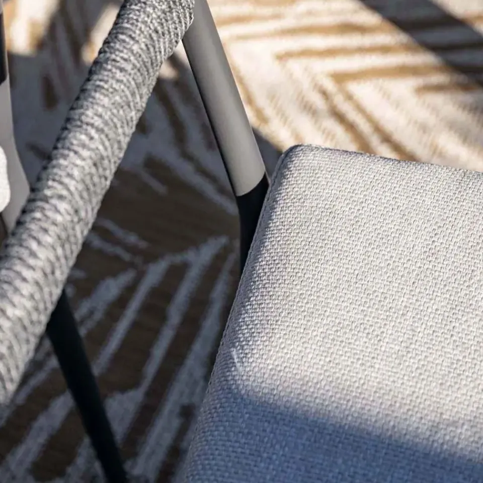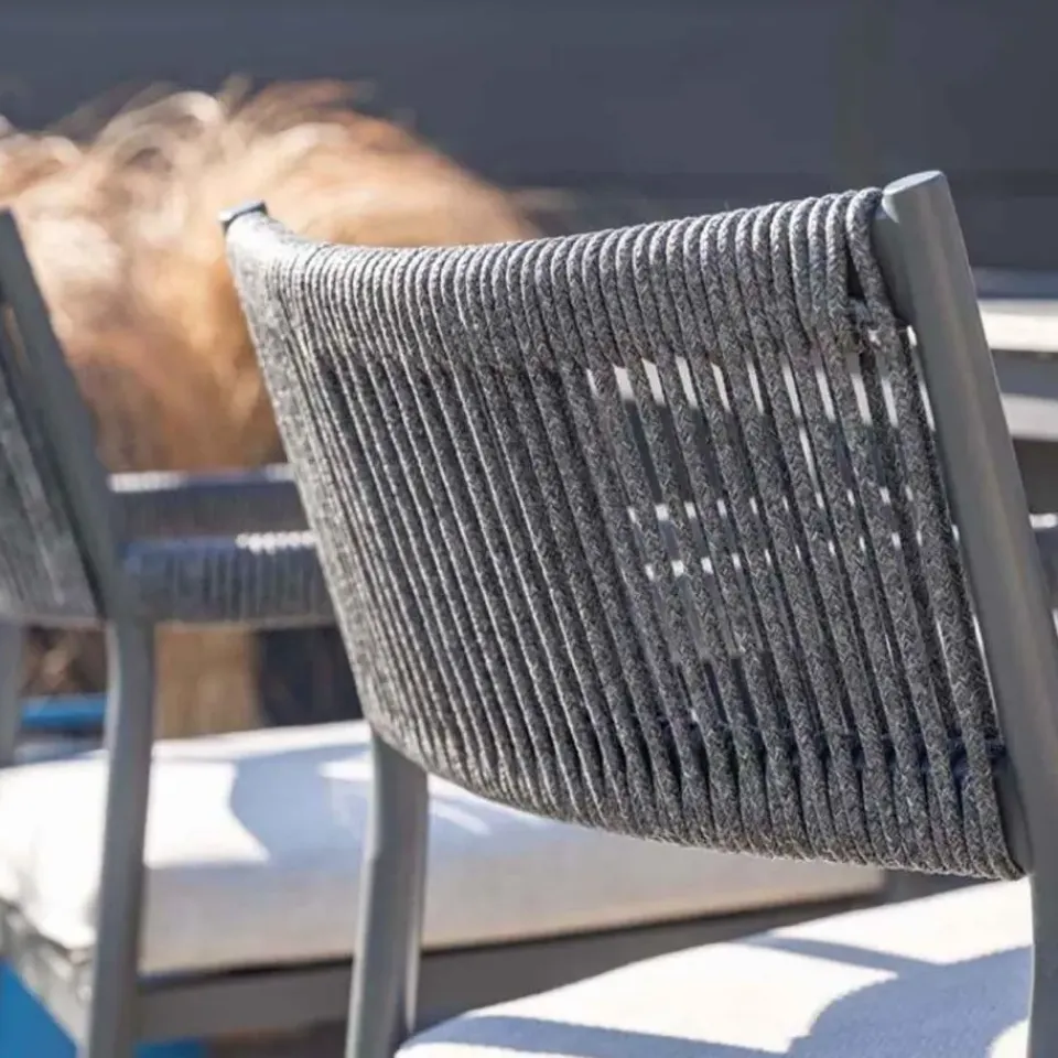 De Tineo tuinstoel heeft een frame dat gemaakt is van aluminium. Dit aluminium is voorzien van een stevige coating. Dit garandeert niet alleen een lange levensduur, maar zorgt ook voor een lichtgewicht stoel die eenvoudig te verplaatsen is. Bovendien is aluminium bestendig tegen alle weersomstandigheden, zodat de stoel het hele jaar door buiten kan blijven staan zonder zijn schoonheid te verliezen. De rugleuning is gemaakt van dark grey kleurig rope. Dit touw is te vergelijken met touw dat in de scheepsvaart gebruikt wordt. Het touw is voorzien van een rubberen kern binnenin met daarin meerdere polyester draden voor de stevigheid. Om de rubberen kern zit solution dyed polyester rope. Dit betekent dat het touw door en door gekleurd is en veel minder snel verkleurt.