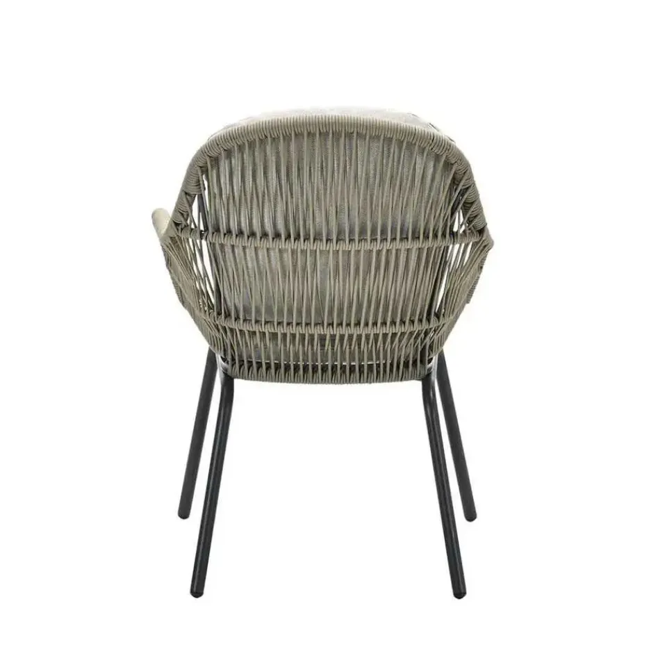 De stoel heeft een aluminium onderstel met een beschermende poedercoating. In de rug- en armleuningen is Qualicord-rope verwerkt, een draad van solution dyed polyester, wat zorgt voor een verhoogde kleurvastheid. De rug- en zitkussens zijn voorzien van een waterafstotende coating, zodat je enkele waterdruppels eenvoudig van de kussens kunt afkloppen. Bij slecht weer raden we je aan de kussens op een droge, warme plek op te bergen.