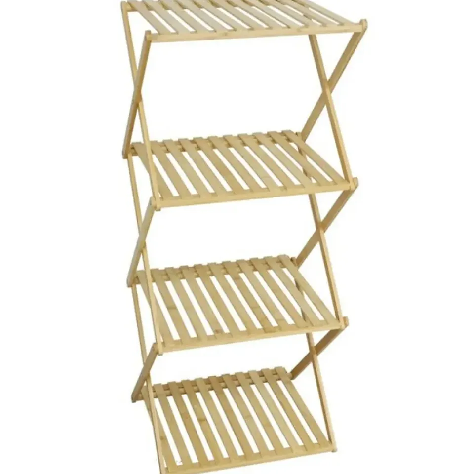 Gerimport Badkamer/keuken rek/organizer van bamboe. Dit opvouwrek met vier niveaus is de natuurlijke blikvanger voor je interieur. Of je het nu gebruikt voor handdoeken in de badkamer, planten in de woonkamer of voorraad in de keuken, dit rek combineert luchtig design met handig opbergen. En ben je even klaar met stapelen? Dan klap je ’m gewoon in en zet je hem compact weg. Fris, functioneel en altijd klaar voor een nieuw plekje! Afmeting: ca. H93,5 x B40 x D33,5 cm.
