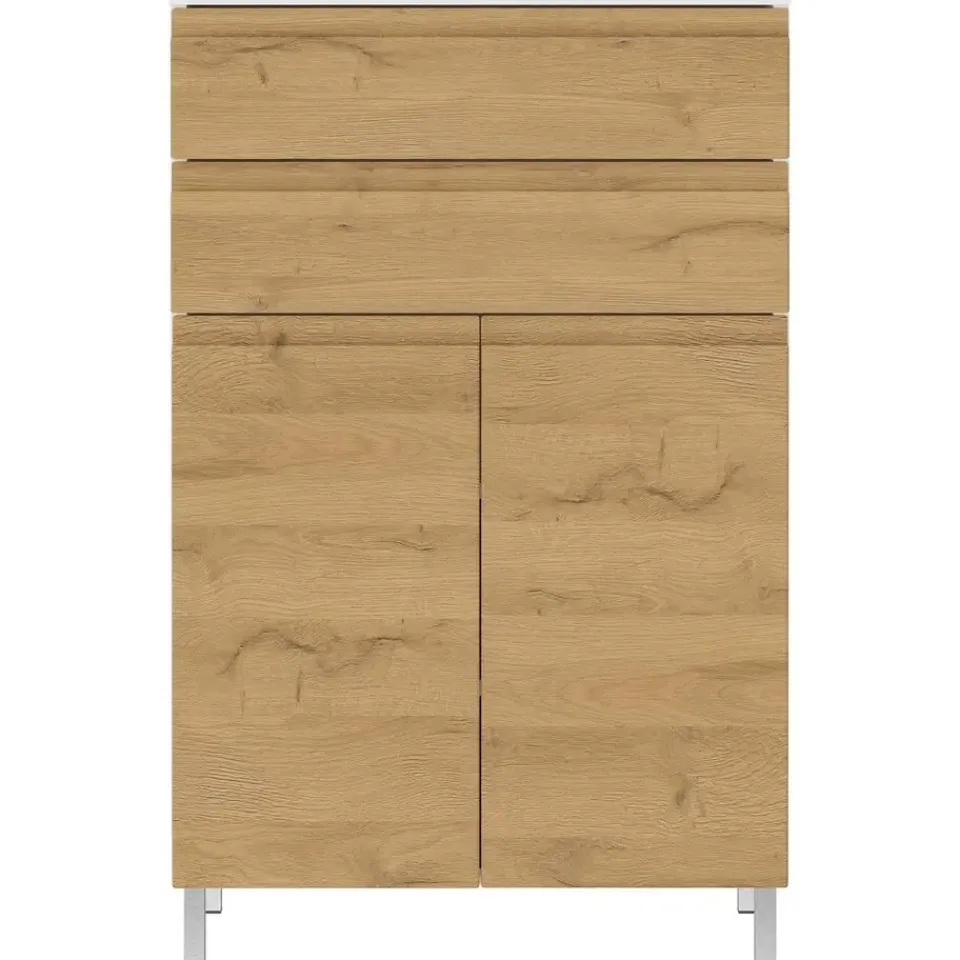 Met hun minimalistisch ontwerp en natuurlijke uitstraling passen de badkamermeubels Torres perfect in de modern landelijke sfeer. Het eikdecor straalt warmte uit terwijl de chroomkleurige pootjes zorgen voor een elegante touch. Deze badkamerkast is uitgerust met twee verstelbare legplanken en twee lades. Hierdoor creëer je ruimte voor al je badkamerspullen zoals handdoeken of verzorgingsproducten. Maak van je badkamer een oase van rust met de collectie Torres.
