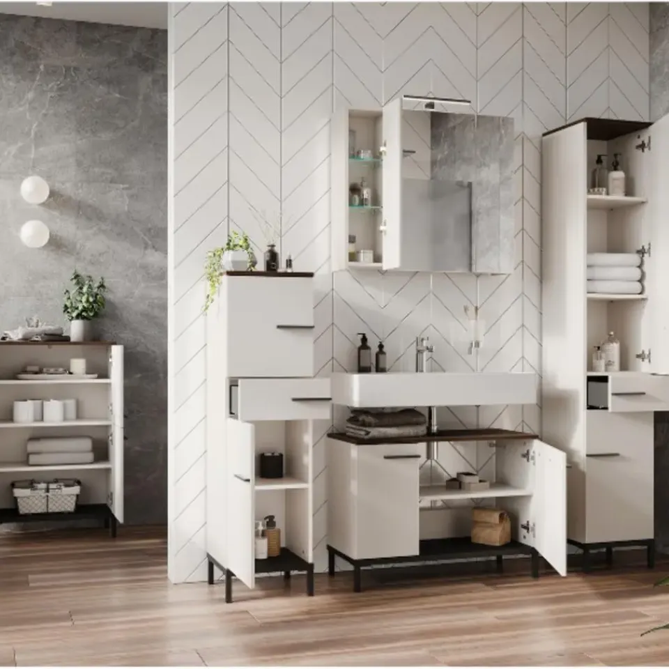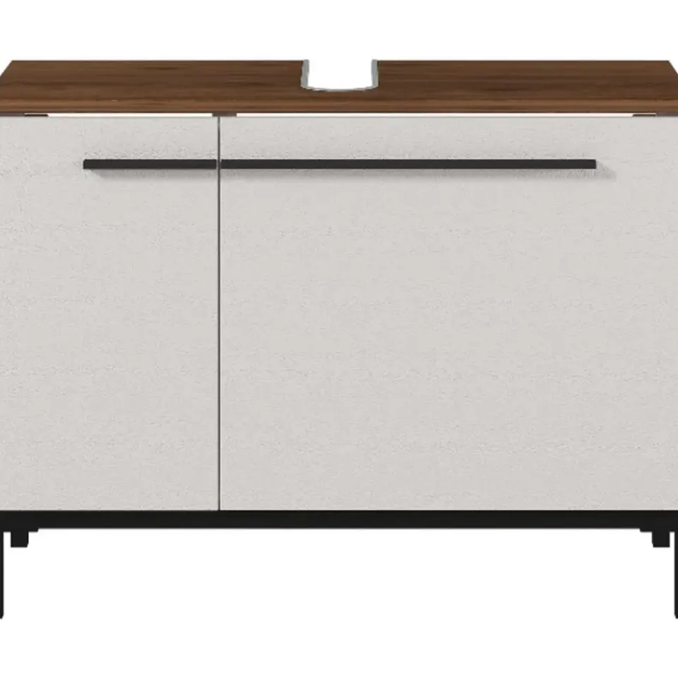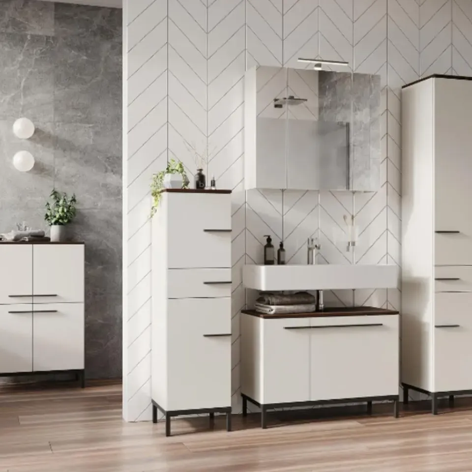 Rondslingerende handdoeken, duizend-en-een flesjes, tubes en potjes rond de wastafel … Nee, het is nog niet zo makkelijk om het overzicht in de badkamer te bewaren. Wil je voorkomen dat jouw badkamer een rommeltje wordt, bekijk dan zeker eens de Charlisa-collectie. Door de combinatie van greige en walnootlook zijn de kasten uit deze collectie ware pareltjes. Deze badkamerkast heeft 2 deuren, waarachter 2 verstelbare legplanken (max. 10 kg per plank) schuilgaan, en kan gebruikt worden om de producten die je vaak nodig hebt binnen handbereik te bewaren. De deuren sluiten dankzij de deurdempers zacht en traag. De zwarte handgrepen en poten geven de kast een moderne, elegante look. Badkamerkast Charlisa is gemaakt uit gemelamineerde spaanplaat.