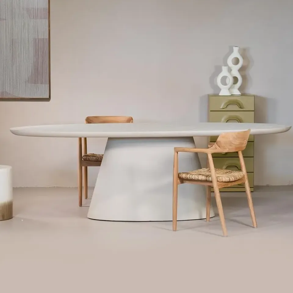 De Eettafel Cleo is een stijlvolle toevoeging aan elk modern interieur. Deze tafel, uitgevoerd in een rustige beige kleur, is volledig vervaardigd uit eco composiet en betonlook materialen, wat zorgt voor een strakke en robuuste uitstraling. Het ovale ontwerp maakt de tafel niet alleen een eyecatcher, maar ook bijzonder praktisch voor sociale gelegenheden. De matte afwerking van het tafelblad zorgt voor een subtiele, eigentijdse flair. Perfect voor wie houdt van een minimalistische stijl met een duurzame kwaliteit.