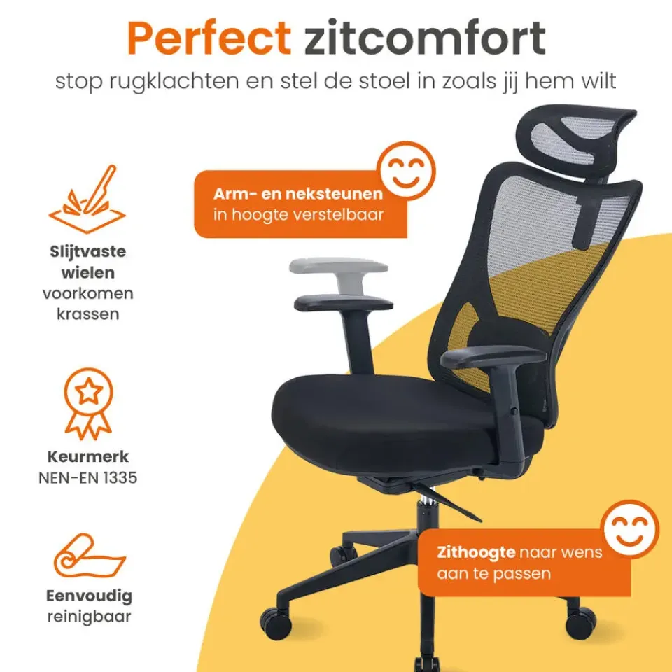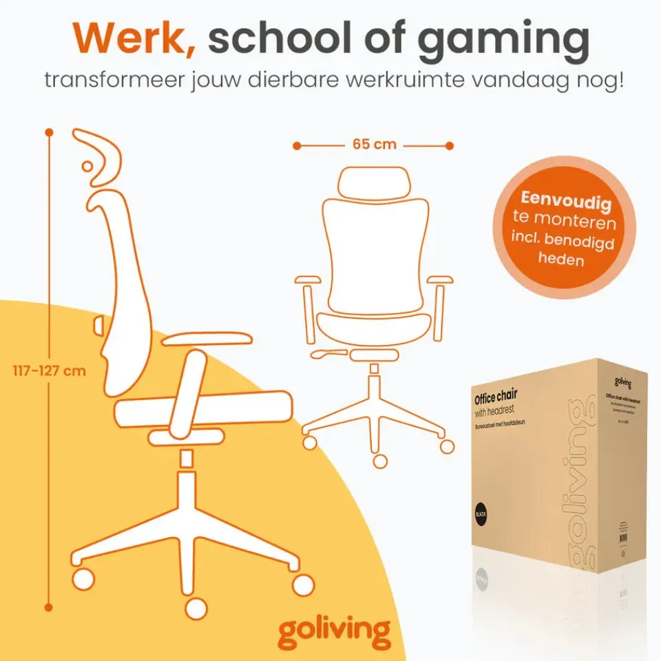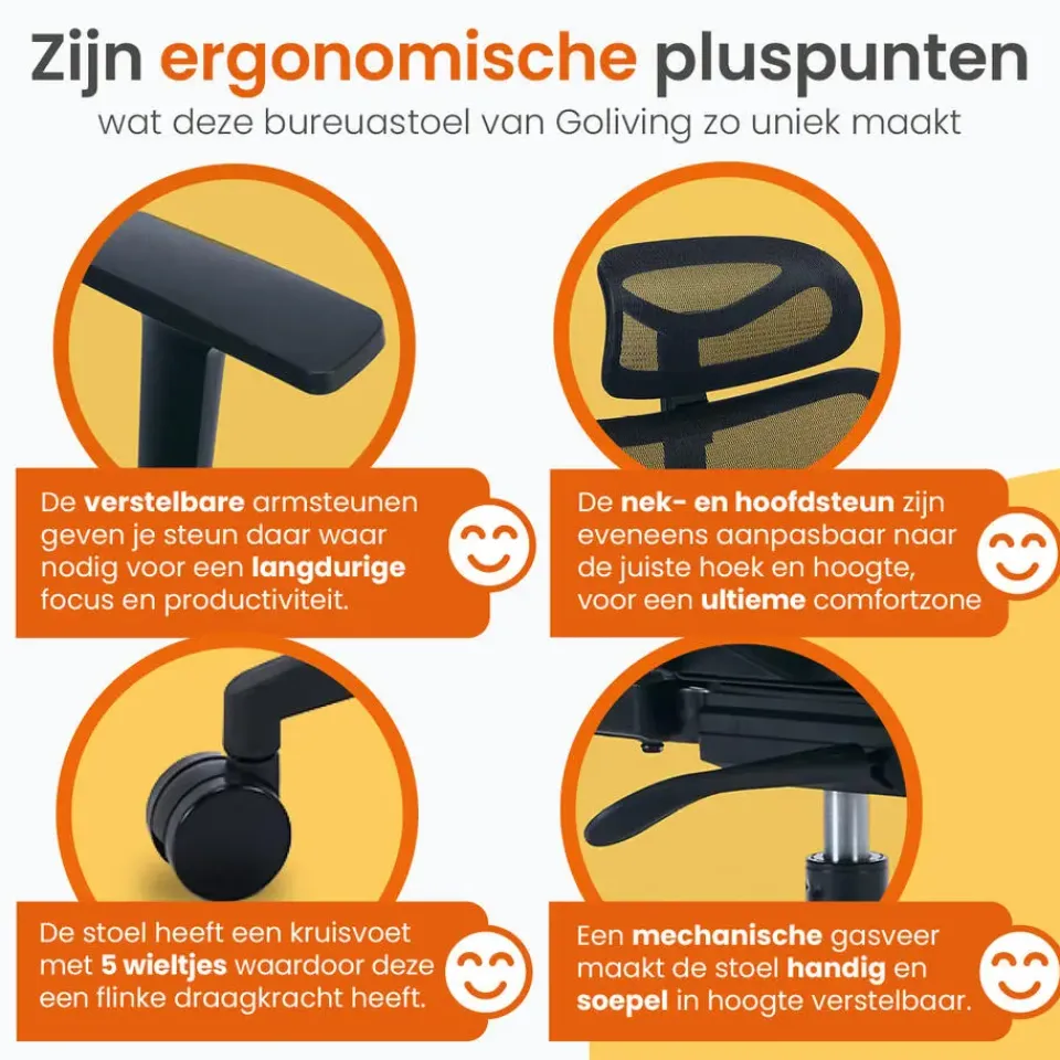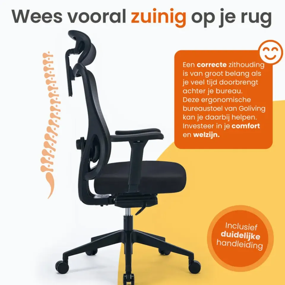 Een fijne werkplek is cruciaal om goed te kunnen presteren. Dat begint natuurlijk bij een degelijke bureaustoel. De bureaustoel is volledig te verstellen, en bevat ademend materiaal op de rugleuning en hoofdsteun. Deze stoel van Goliving is daarnaast uitgevoerd met een lendensteun, armsteunen en hoofdsteun, voor een ideale zitpositie. Je rug en postuur zullen je dankbaar zijn!