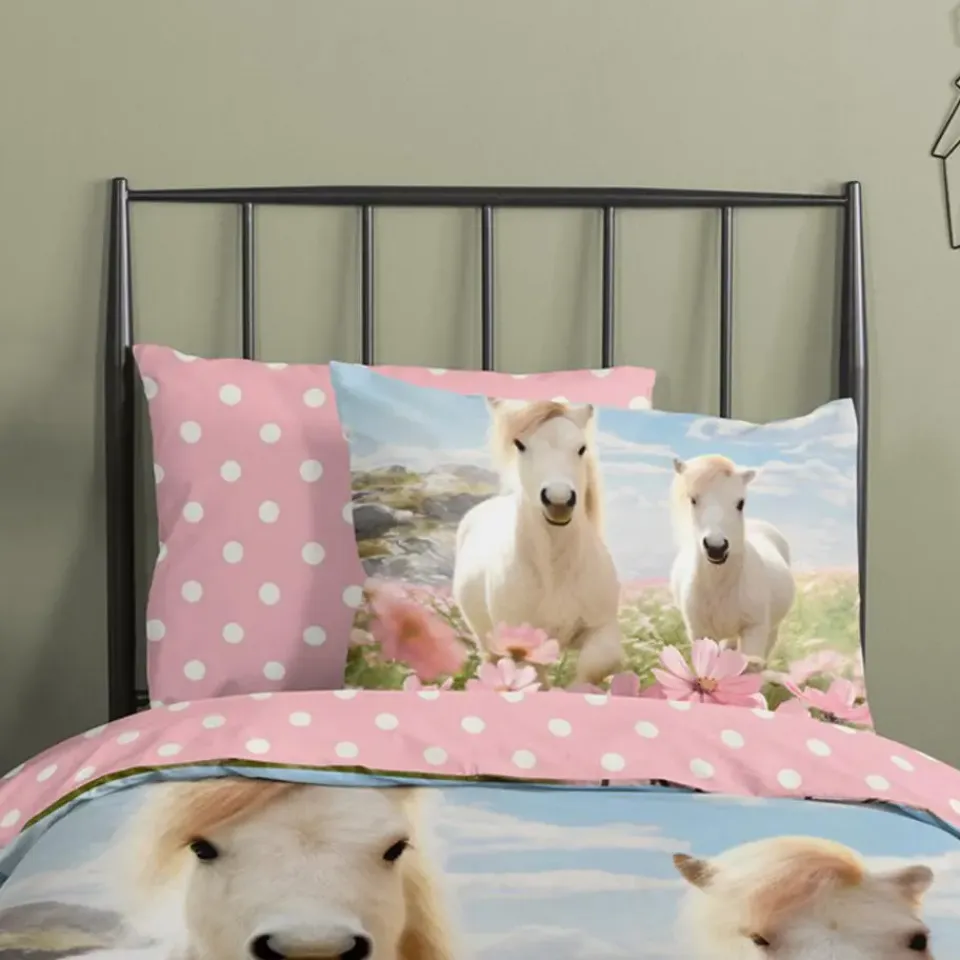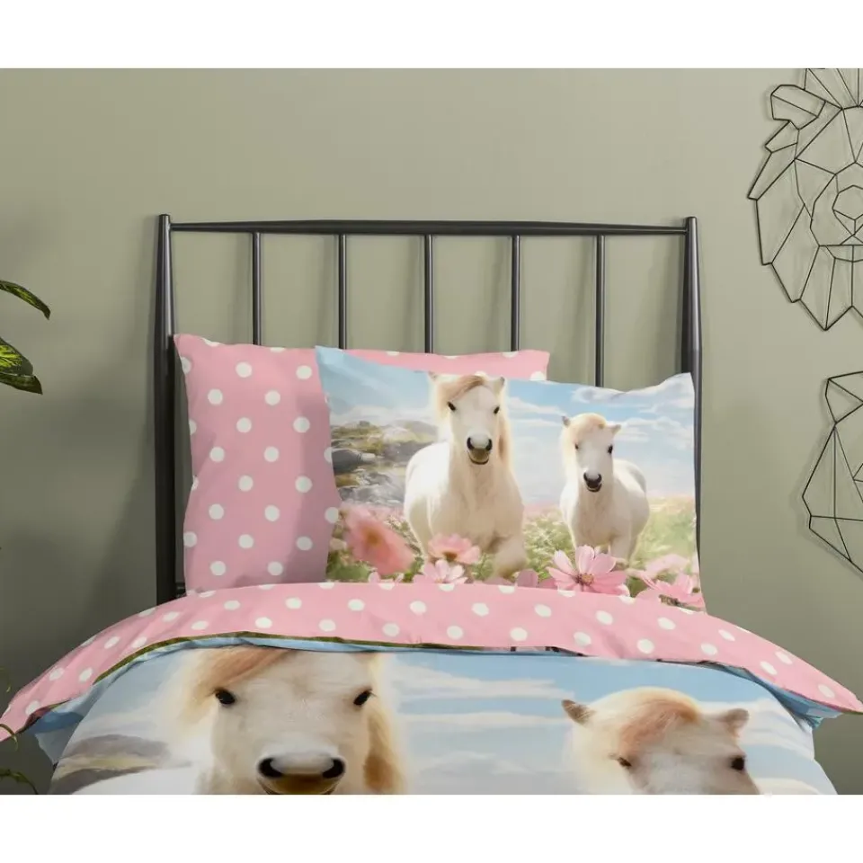 Kinderdekbedovertrek Philou van Good Morning in de kleur roze, met een print van witte paarden met bloemen. Het dekbedovertrek is gemaakt van 100% katoen. Deze kwaliteit is ademend, vochtabsorberend en voelt zacht en soepel aan. Dit leuke kinderdekbedovertrek is een leuke toevoeging aan iedere kinderkamer. Het kinderdekbedovertrek is geschikt voor ieder jaargetijde. Het katoenen 100% katoen is heerlijk koel in de zomer en geeft warmte in de winter.