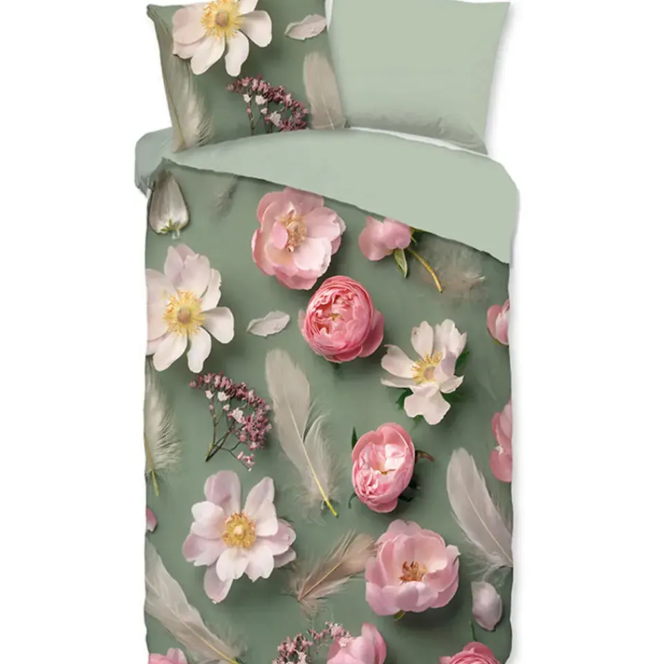 Flanellen dekbedovertrek Senzi van Good Morning, in de kleur groen, met een print van eenBloemen. Het dekbedovertrek is gemaakt van 100% katoen/flanel dat is licht geruwd, waardoor een fluweelzacht laagje ontstaat dat heerlijk warm aanvoelt -perfect voor koude nachten.