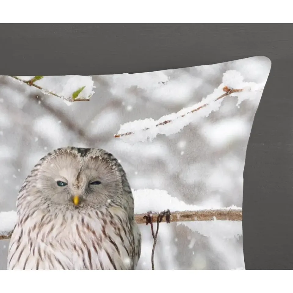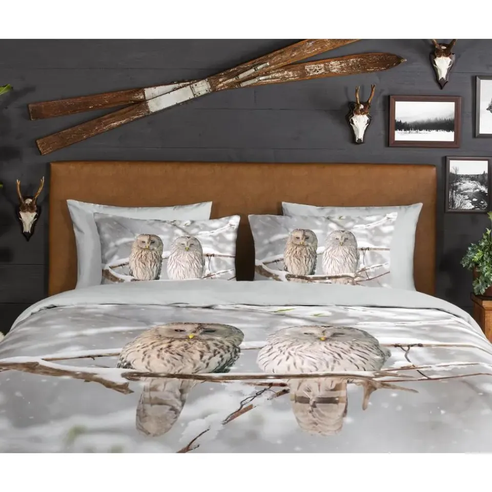 Flanellen dekbedovertrek Febe van Good Morning, in de kleur grijs, met een print van uilen in winterlandschap. Het dekbedovertrek is gemaakt van 100% katoen/flanel dat is licht geruwd, waardoor een fluweelzacht laagje ontstaat dat heerlijk warm aanvoelt -perfect voor koude nachten.