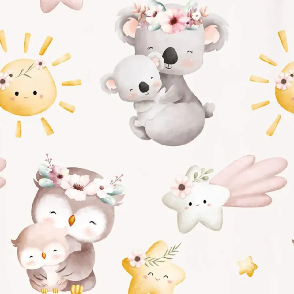 Laat je meevoeren in een wereld vol liefde en warmte, waarin schattige koala’s en uiltjes met bloemkroontjes de hoofdrol spelen. Om hen heen zweven zachte wolkjes, speelse sterretjes en glinsterende zonnetjes, elk met hun eigen lieve glimlach. Het palet – van lichtroze en mintblauw tot beige en okergeel – straalt rust en harmonie uit.