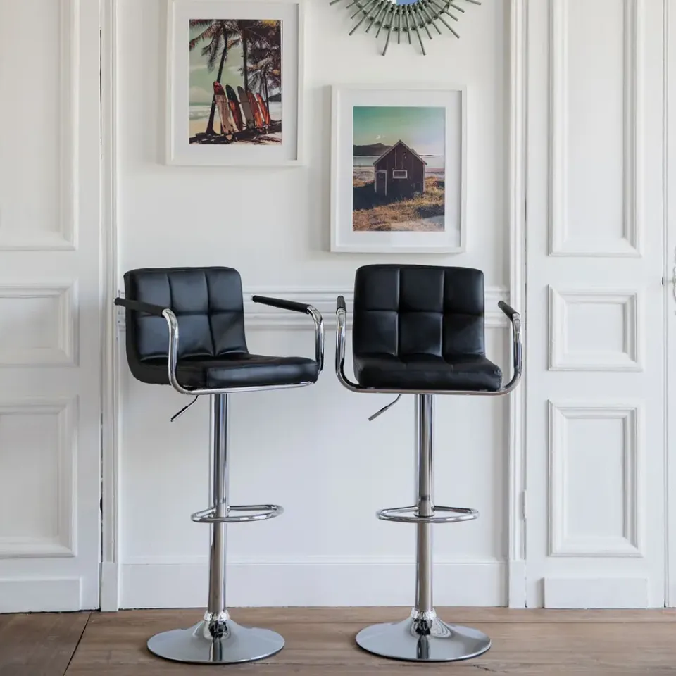 MIKE barkrukken zijn ontworpen met moderne kwaliteitsmaterialen: de combinatie van chroomstaal en zwart polyurethaan geeft uw kamer een eigentijdse look zonder te beknibbelen op robuustheid. U zit comfortabel dankzij de zachte en gewatteerde zittingen, en u zit perfect dankzij de voetsteunen en armsteunen. Deze hoge krukken zijn in hoogte verstelbaar en 360° draaibaar.