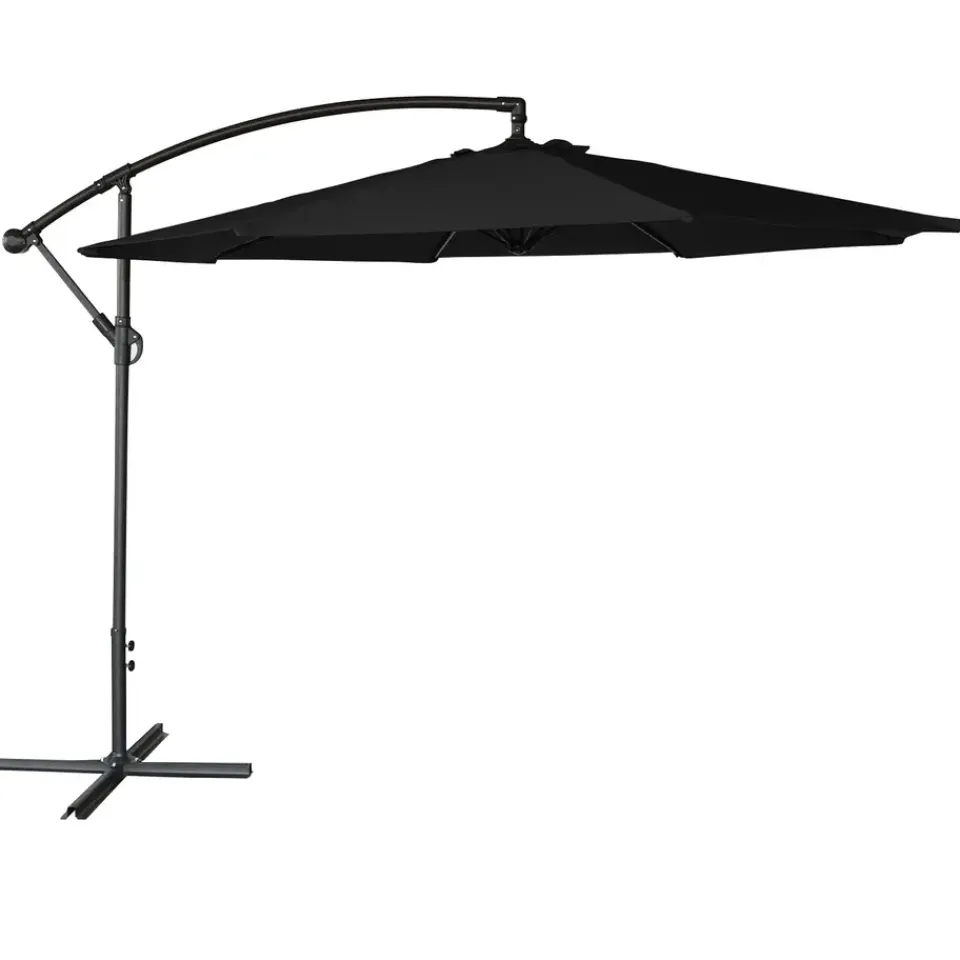 Wat de accessoires betreft, is het noodzakelijk ballast of opvulbare platen toe te voegen om ervoor te zorgen dat het op zijn plaats blijft. Happy Garden adviseert u ook om uw excentrieke parasol te beschermen met een hoes wanneer u hem niet gebruikt, zodat hij beschermd is tegen slecht weer.