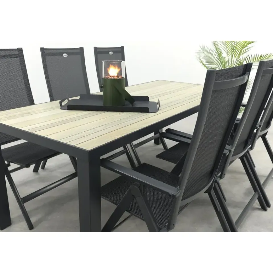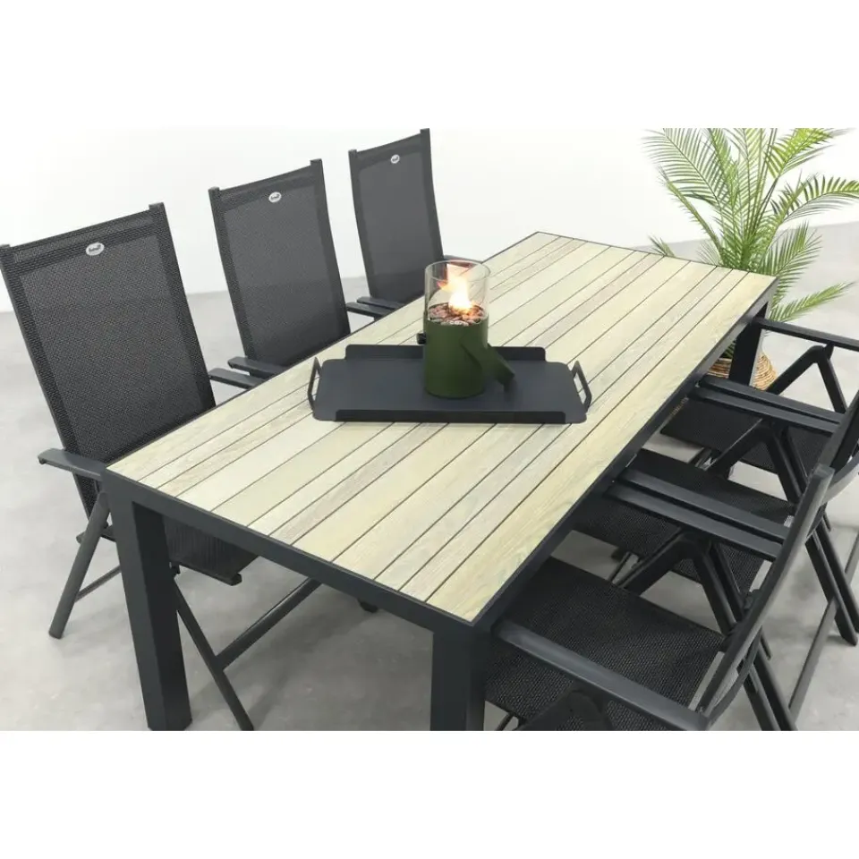 De Nola tuintafel is gemaakt van aluminium, een materiaal dat bekendstaat om zijn stevigheid en weerbestendigheid. Het tafelblad heeft een realistische houtlook die zorgt voor een warme en natuurlijke sfeer in je tuin, zonder het onderhoud dat echt hout vereist. Regen, zon of wind? Geen probleem, deze tafel blijft er mooi uitzien. De royale afmeting van 210×90 cm biedt voldoende ruimte voor gezellige diners of borrels. En goed om te weten: de Nola is ook verkrijgbaar in twee andere formaten (90x90en160x90 cm.), zo kies je altijd de maat die past bij jouw tuin.