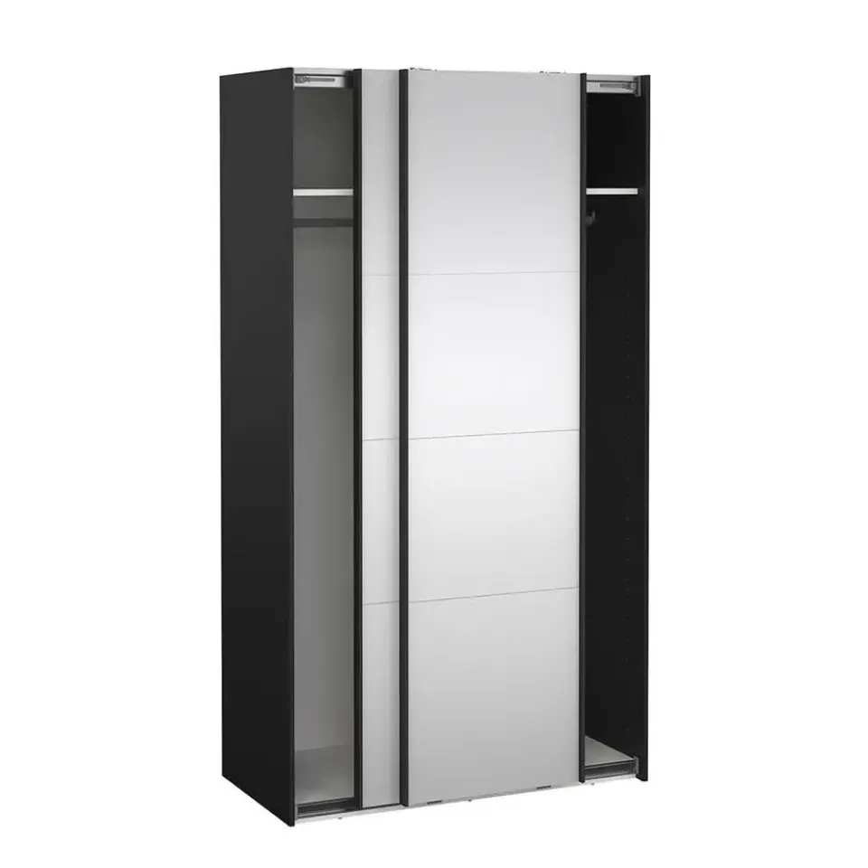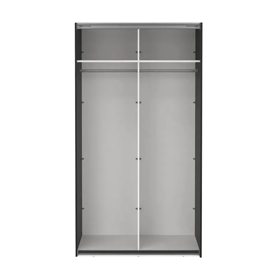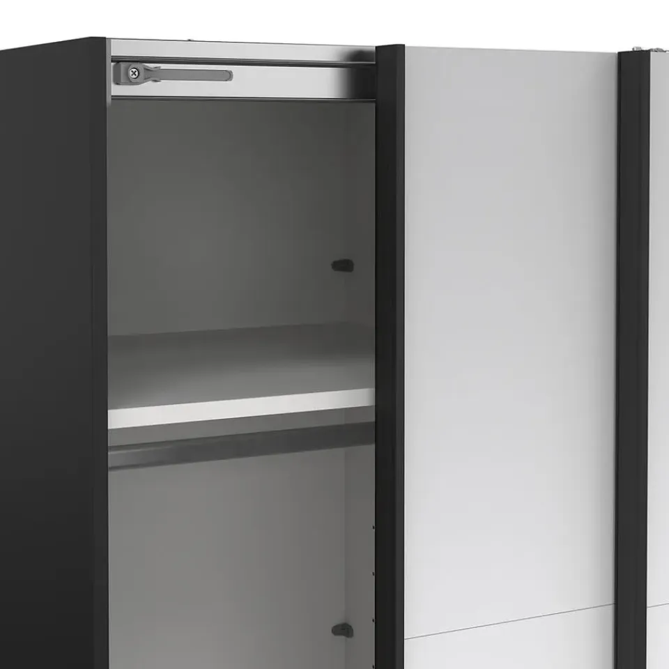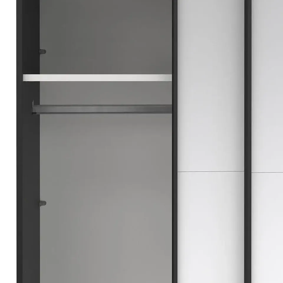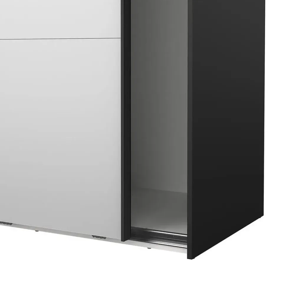 De Catania schuifdeurkast in matzwart met spiegeldeuren combineert functionaliteit met stijlvol design. Met een hoogte van 220 cm biedt de kast veel opbergruimte in de hoogte – ideaal voor kleinere kamers of hoge plafonds. De geïntegreerde spiegels op beide deuren maken uw outfit gemakkelijk te zien en creëren tegelijkertijd een gevoel van ruimte en licht. Het matte oppervlak geeft de kast een moderne en exclusieve uitstraling, die perfect past bij zowel minimalistische als donkere interieurs. De schuifdeuren zijn praktisch en ruimtebesparend, en de slimme indeling achter de deuren kan naar wens worden aangepast.