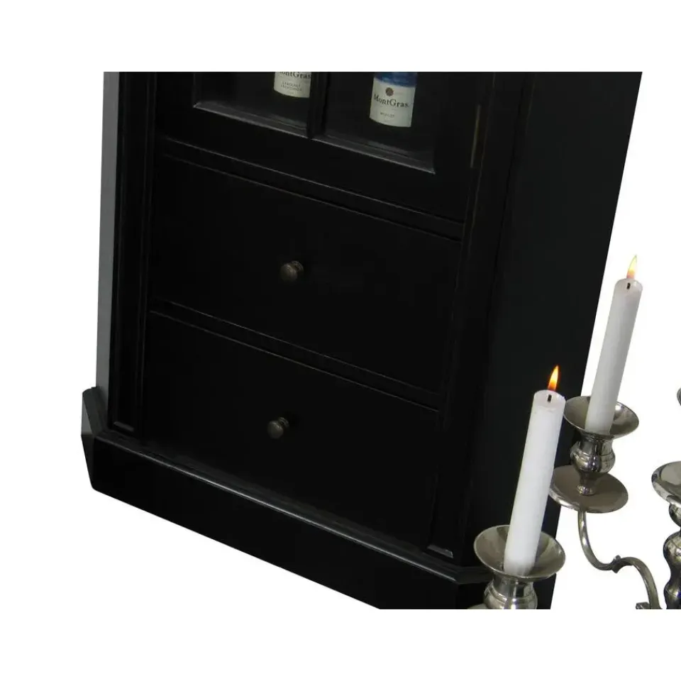 Amaretta hoekkast breedte 78 cm, hoogte 200 cm zwart antiek gepatineerd is een vitrinekast in de kleur zwart die zowel stijl als functionaliteit in uw huis brengt. Prachtige hoekkast uit onze populaire meubelserie Amaretta. De kast is gemaakt van massief hout dat zwart geverfd is en een antieke patina heeft. De handgrepen zijn van metaal in antieke stijl, de kast heeft 3 planken en 2 lades. De Amaretta serie is gemaakt van goede materialen met oog voor detail. Solide kwaliteitsmeubels met ziel. Stijlvol ontwerp met antieke patinatie. Een kwaliteitsmeubel, stijlvol, charmant en solide. Dit product is gemaakt met oog voor detail, wat zowel esthetische aantrekkingskracht als hoge duurzaamheid garandeert. Het is ontworpen met zowel functionaliteit als stijl in gedachten, waardoor het de perfecte keuze is voor elke kamer in uw huis. De gebruikte materialen zijn van hoge kwaliteit, waardoor het product een lange levensduur heeft en bestand is tegen dagelijks gebruik. Of het nu voor opslag is of als decoratieve toevoeging, dit product zal uw interieur naar een hoger niveau tillen en extra comfort en elegantie in uw huis brengen.