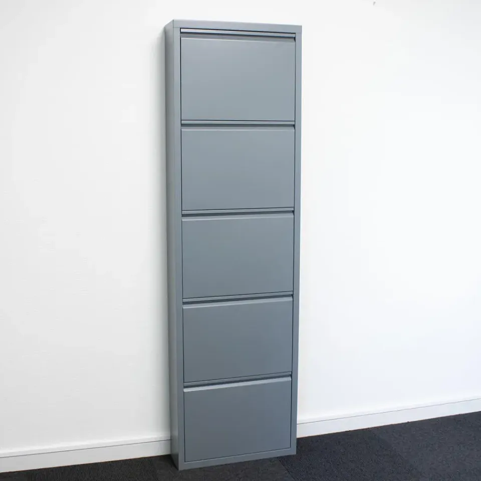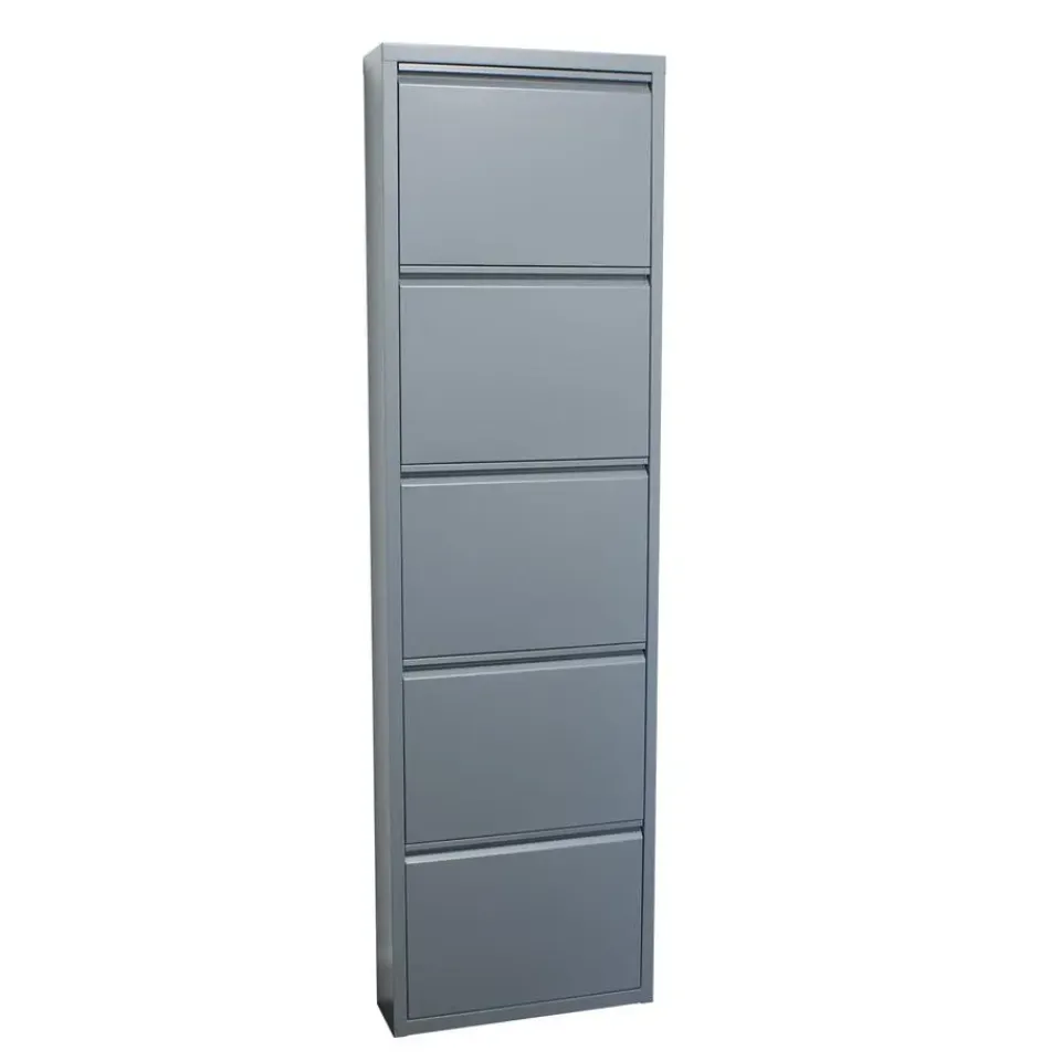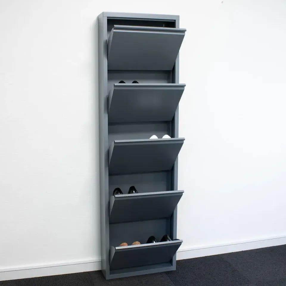Pisa schoenenkast met 5 deuren in metaalgrijs. Volledig gemonteerd geleverd is een schoenenkast in de kleur grijs, die zowel stijl als functionaliteit in uw huis brengt. Wordt volledig gemonteerd geleverd. Ral 7031 grijs. Lade binnenkant: B46/L29/D13 cm. Kan op de vloer worden geplaatst of aan de muur worden gehangen. Kan individueel gebruikt worden. Deuren gaan gelijktijdig open. Dit product is gemaakt met oog voor detail, wat zowel esthetische aantrekkingskracht als hoge duurzaamheid garandeert. Het is ontworpen met zowel functionaliteit als stijl in gedachten, waardoor het de perfecte keuze is voor elke kamer in uw huis. De gebruikte materialen zijn van hoge kwaliteit, waardoor het product een lange levensduur heeft en bestand is tegen dagelijks gebruik. Of het nu voor opslag is of als decoratieve toevoeging, dit product zal uw interieur naar een hoger niveau tillen en extra comfort en elegantie in uw huis brengen.