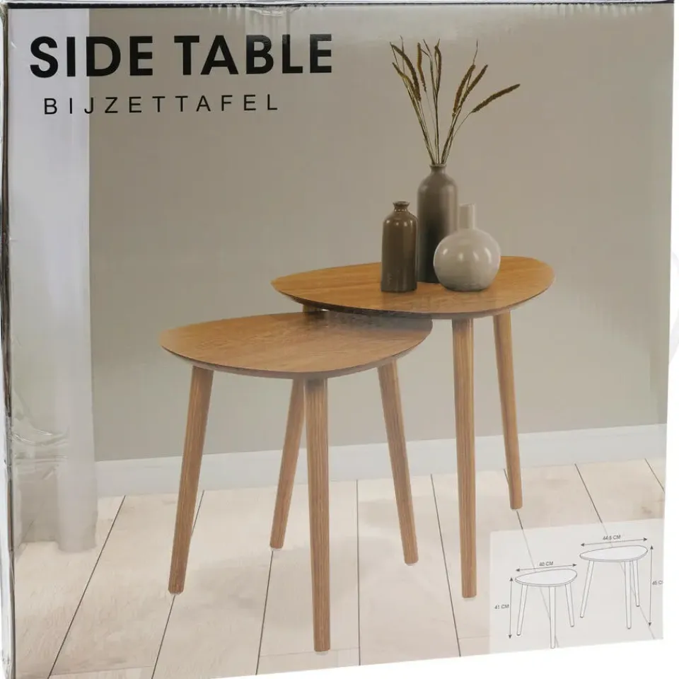Bijzettafeltjes set van 2x stuks, type Ancona, met glad uni kleur tafelblad. Tafeltjes voor glazen, lampen, boeken en/of bruikbaar als een plantenpot verhoger. Deze bijzet tafels zijn gemaakt van dennenhout. Afmetingen: D40 x H41 cm en D45 x H45 cm. Kleur onderstel: lichtbruin. Kleur blad: lichtbruin. De neutraal ogende look zorgt ervoor dat deze in elk interieur passen.