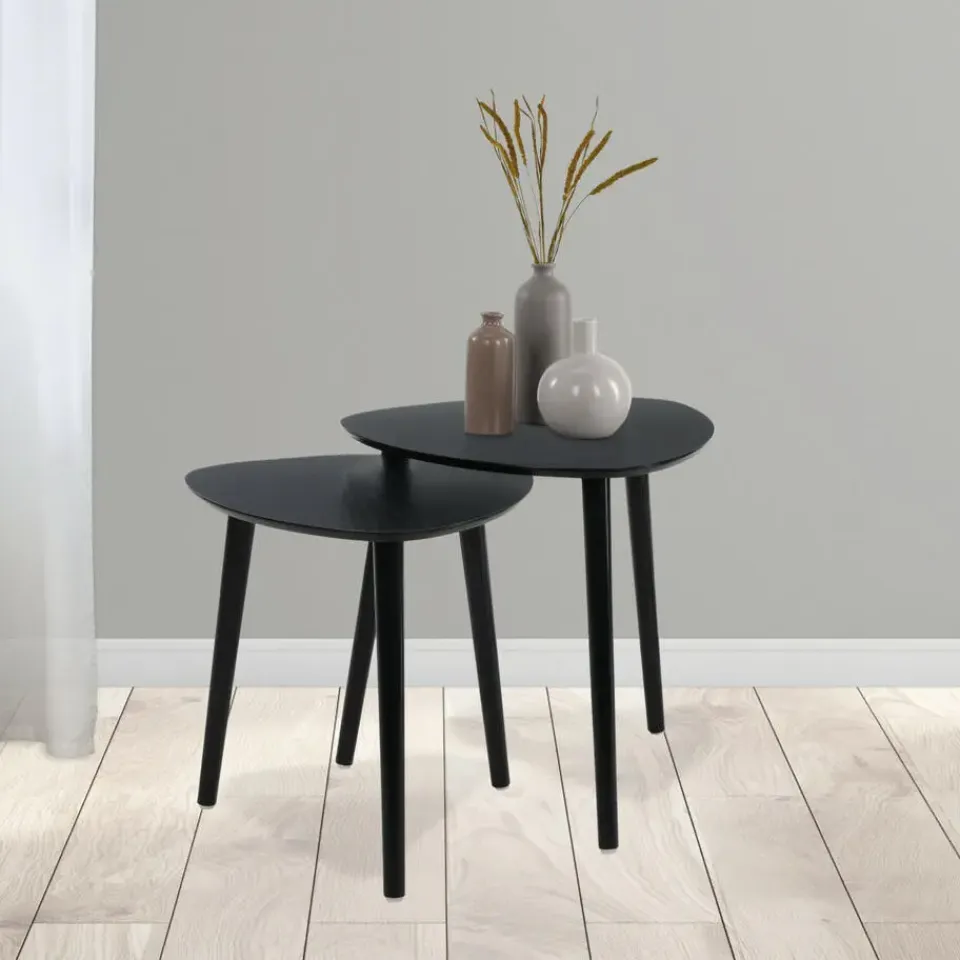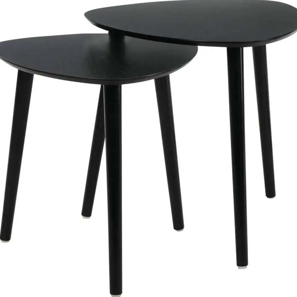 Bijzettafeltjes set van 2x stuks, type Ancona, met glad uni kleur tafelblad. Tafeltjes voor glazen, lampen, boeken en/of bruikbaar als een plantenpot verhoger. Deze bijzet tafels zijn gemaakt van dennenhout. Afmetingen: D40 x H41 cm en D45 x H45 cm. Kleur onderstel: zwart. Kleur blad: zwart. De neutraal ogende look zorgt ervoor dat deze in elk interieur passen.
