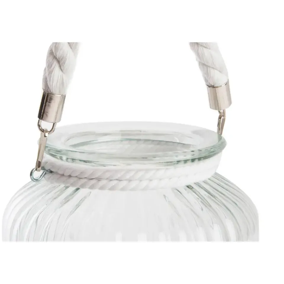 Wit glazen windlicht met touw – diameter 18 cm, hoogte 18 cm*Deze decoratieve kaarshouder is gemaakt van glas en heeft een wit touw als handvat voor een natuurlijke uitstraling. Met een diameter en hoogte van ongeveer 18 cm is het windlicht geschikt voor waxinelichtjes, stompkaarsen, theelichtjes en kleine kaarsjes. Een sfeervol accessoire dat warmte en gezelligheid brengt in jouw interieur.