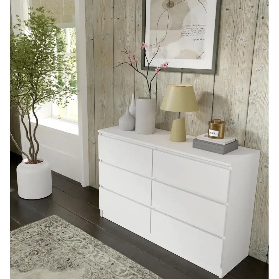 De stevige constructie en ruime laden zorgen voor dagelijks comfort en orde. De dressoir is vervaardigd uit duurzame, 16 mm dikke gelamineerde plaat, terwijl de strakke, greeploze fronten de moderne uitstraling versterken en gebruiksgemak bieden.