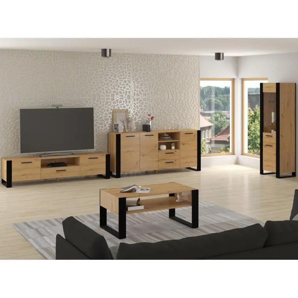 De stijlvolle NUKA commode met trendy accenten voor de woonkamer of slaapkamer is een echt meesterwerk van design. Zijn moderne uitstraling en aangename kleurenpalet maken het perfect geschikt voor verschillende interieurs. Grote zwarte poten in framevorm voegen karakter toe aan het meubel en vormen een uitstekend contrast met de rest. De commode heeft twee gesloten planken aan de zijkanten, inclusief één dubbele plank, wat zorgt voor veel ruimte om verschillende voorwerpen op te bergen. Daarnaast zijn twee open planken ideaal voor het tentoonstellen van decoraties of favoriete boeken, terwijl twee laden extra functionaliteit bieden. Zwarte handgrepen van het boxsysteem completeren het elegante uiterlijk van de commode, waardoor een samenhangend geheel ontstaat. De karakteristieke poten, ondersteund door een extra steun in het midden, garanderen stabiliteit, waardoor dit meubel niet alleen visueel aantrekkelijk is, maar ook praktisch en duurzaam in uw interieur.