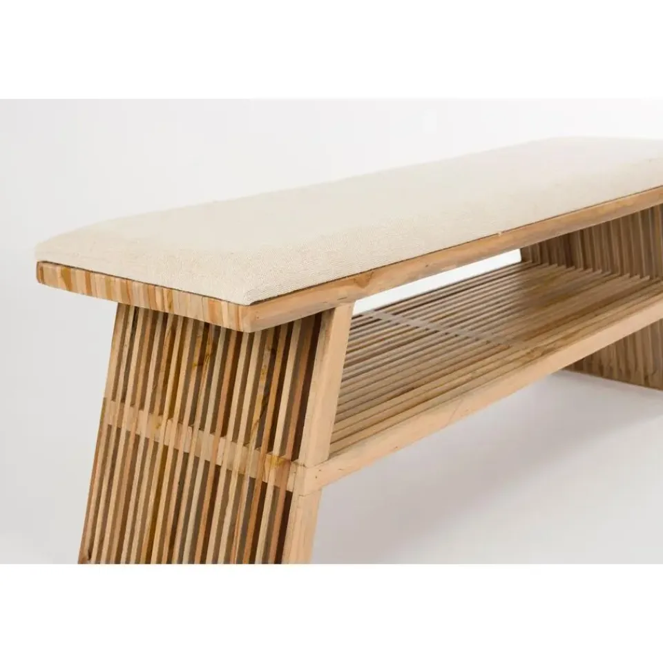 Ontdek de Djia serie, een stijlvolle collectie meubels gemaakt van duurzaam teak hout. Met hun unieke ontwerp van houten latten en open ruimtes brengen deze tafels, kasten, krukken en bankjes een prachtig spel van licht en schaduw in uw interieur.