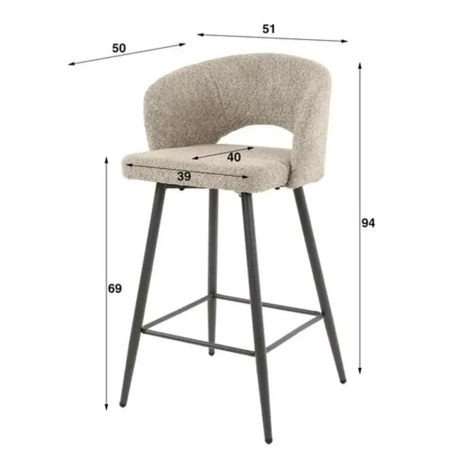 Deze barstoel ‘boucle salon’ is uitgevoerd in bouclé met een metalen onderstel. De rug is afgewerkt met een ronding en een open vak. Dit geeft de stoel een chique en speelse uitstraling. De stoel heeft een comfortabele zit. Dus een trendy stoel met hoog comfort! De barstoel is per 2 stuks verpakt.