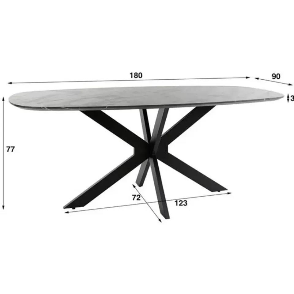 Deze eetkamertafel is uitgevoerd in melamine met een marmer uitstraling en een spider frame in staal. De tafel is haast niet te onderscheiden van een marmeren tafel. Het handgemaakte tafelblad is voorzien van een laagje melaminehars dat is aangebracht op hout. Het materiaal wordt door hitte en druk aangebracht. Het prachtige materiaal in combinatie met de deens ovale vorm, geeft een trendy, maar tegelijk ook tijdloze tafel. Deze tafel is verkrijgbaar in twee maten, namelijk 180 cm en 215 cm.