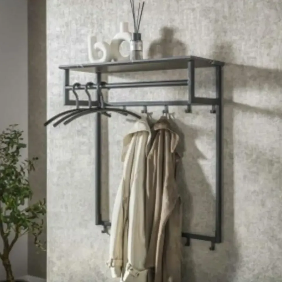 Deze kapstok is uitgevoerd in melamine met een ceramic uitstraling en beschikt over 12 haken, een roede en een prachtige hoedenplank. Deze kapstok is eigentijds en zo stijlvol. De kapstok wordt door middel van 2 schroefgaten aan de achterzijde aan de wand gemonteerd.