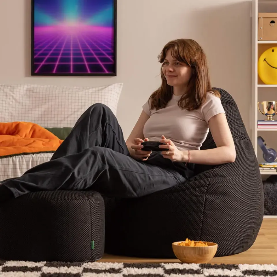 ONDERSTEUNENDE RECLINER & VOETENBANK: Deze gaming zitzak met voetenbank is ergonomisch ontworpen in een recliner-vorm, met een hoge rugleuning en slimme interne stofstructuur voor ultiem comfort tijdens lange gamesessies. Door de aard van met bonen gevulde producten kunnen de afmetingen licht variëren.