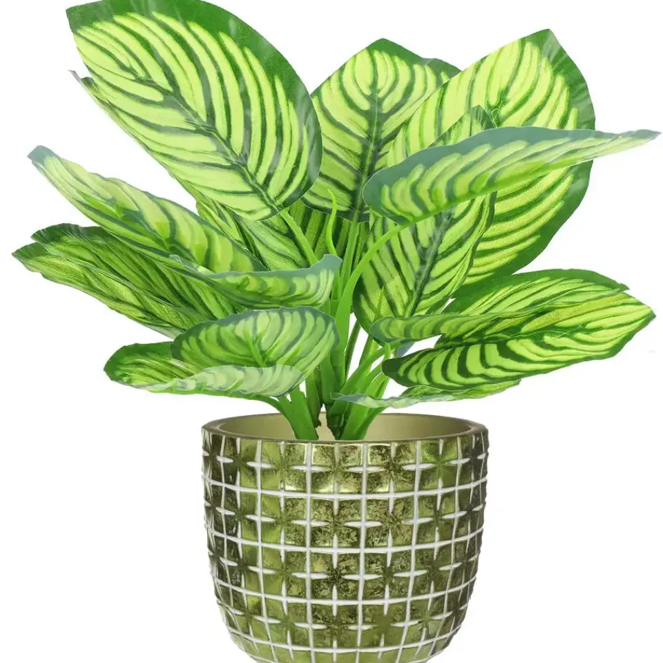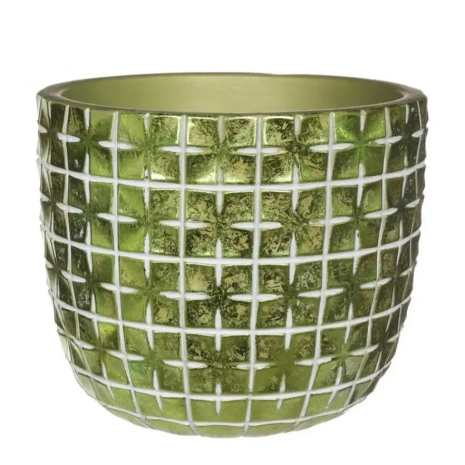 Bloempot/plantenpot Hanoi ruit motief in metallic groen. Bloempot met een luxe uitstraling waarin planten en bloemen volledig tot hun recht komen. Te gebruiken voor allerlei soorten (kunst) kamerplanten, maar ook leuk om bijvoorbeeld een paar takken of droogbloemen in te zetten. Deze eyecatcher voor in huis past in ieder interieur. Afmetingen: D18 x H15 cm. Materiaal: Aardewerk. Geschikt voor binnenshuis.