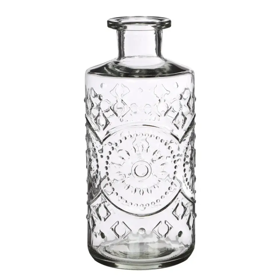 Bloemenvaas/siervaas fles model Berlin in helder transparant glas, met sierlijk motief. Formaat 9 x 21 cm. Deze prachtig gedetailleerde vaas is uitstekend te gebruiken voor losse bloemen, takken en als decoratief object voor binnen gebruik. Ook leuk te gebruiken om een kaars in te zetten, of als olielampje met een lont erin. De mond van de fles is ca. 4 cm breed.