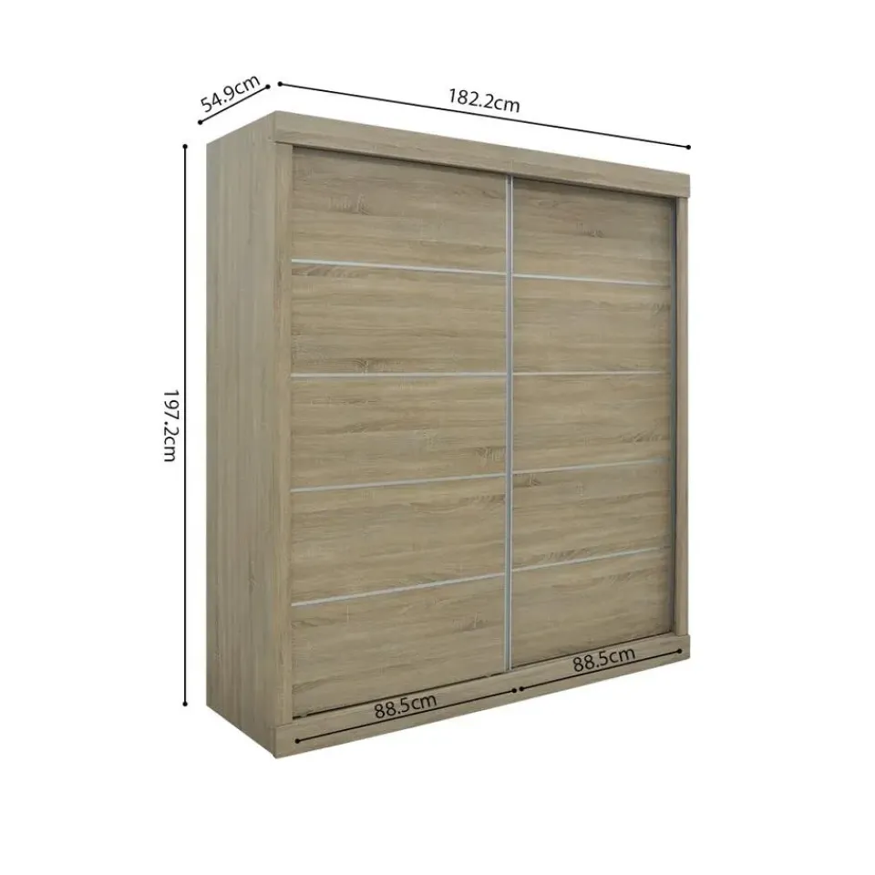 De Interiax Kledingkast ‘Mila’ in Sonoma Eik is de ideale schuifdeurkast voor wie op zoek is naar stijl en efficiëntie in opbergen. Met royale afmetingen van 197.5×182.5×52.5 cm biedt deze kast veel ruimte zonder extra vloeroppervlak in beslag te nemen. De kast beschikt over een ruime hanger voor het netjes ophangen van kledingstukken zoals jassen, jurken en overhemden, en 4 legplanken om kleding, beddengoed en accessoires overzichtelijk te organiseren. Het schuifdeursysteem zorgt voor een moderne uitstraling en maakt de kast extra geschikt voor kleinere ruimtes.