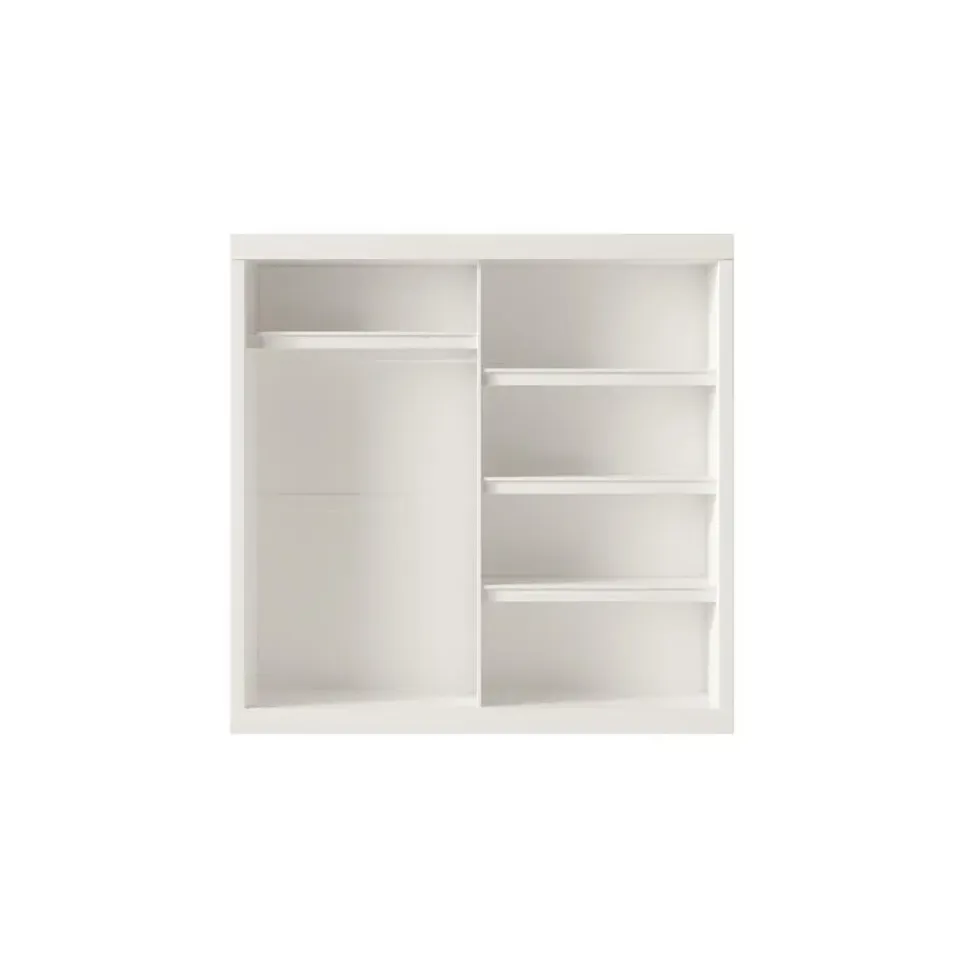De Interiax Kledingkast ‘Mila’ in wit is een stijlvolle en praktische toevoeging aan elke slaapkamer, met een perfecte balans tussen opbergruimte en modern design.