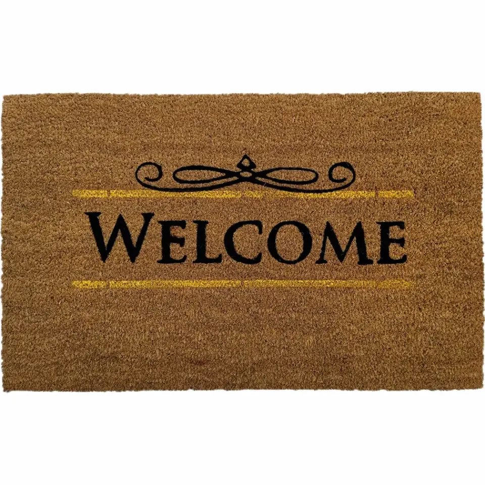 Deze leuke kokosmat geeft een gezellige sfeer aan jouw entree. De opdruk ‘Welcome’ is gecombineerd met twee gele en een sierlijke zwarte lijn voor een luxe uitstraling. De deurmat van kokosvezel is niet alleen een leuke eye-catcher voor jouw interieur, het heeft ook nog eens een reinigende werking.