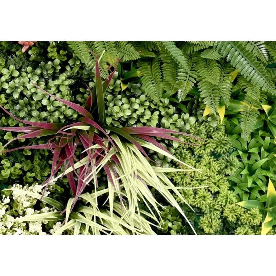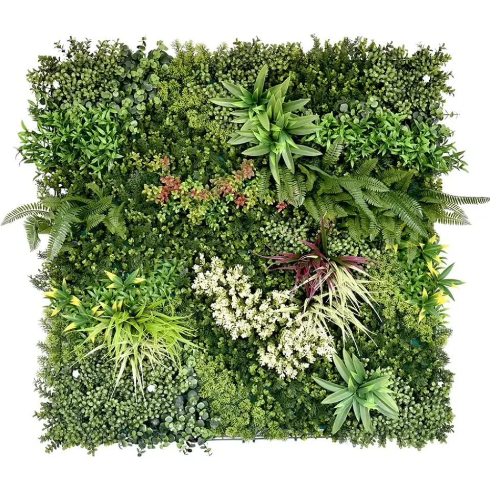 De kunstheg is ontworpen om een natuurlijke sfeer te creëren op iedere gewenste locatie. Deze decoratieve wandpanelen zijn bedekt met een mix van groene planten. De varens en kleine bloemen geven de kunsthaag een levendige en natuurlijke uitstraling. Ze kunnen gebruikt worden voor verschillende ruimtes en gelegenheden, zowel binnen als buiten.