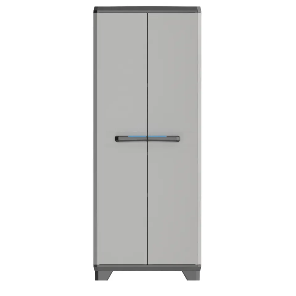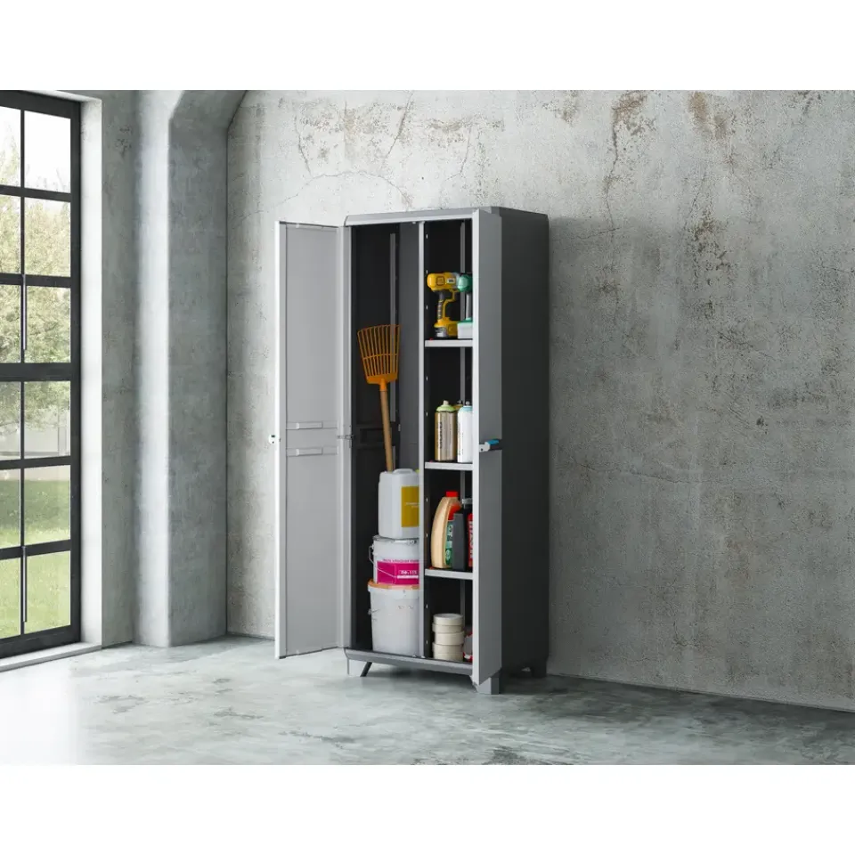 Keter Linear Utility is hoge kunststof opbergkast. De opbergkast heeft een handige indeling waarmee je spullen van verschillende afmetingen kunt opbergen. De rechterhelft heeft namelijk 3 verstelbare legborden en de linkerzijde heeft verticale opbergruimte, zodat je daar bijvoorbeeld bezems of tuingereedschap in kunt opbergen.