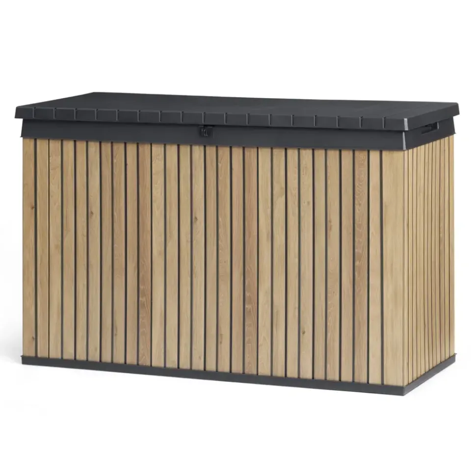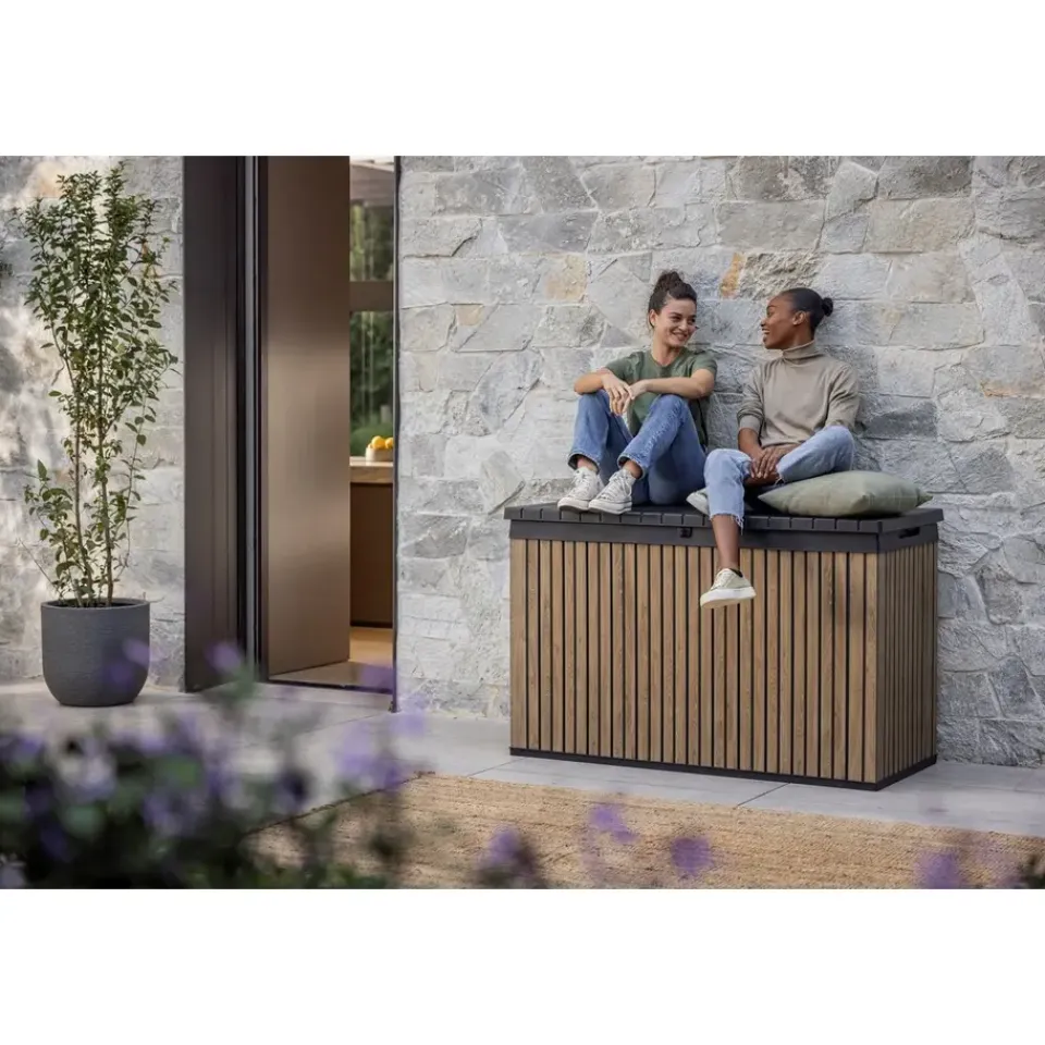 De Keter Venetian opbergbox 670L houdt je buitenruimte onberispelijk en opgeruimd. Deze rustieke kussenbox met houteffect is gemaakt met de nieuwste DECoCOAT UV-beschermde materialen. Deze is ontworpen om bestand te zijn tegen zon en regen en zal het hele jaar door alles. van kussens tot barbecue spullen. droog en geventileerd houden. De gasveren maken het openen van de tuinkussenbox heel eenvoudig. terwijl een afsluitbaar deksel je spullen beschermd houden. De Signature Collection is gemaakt van kunststof. maar heeft door de unieke materiaal- en printtechnologie de look en het gevoel van echt hout. tot aan de nerf toe. Maar in tegenstelling tot hout. zijn deze verbluffende afwerkingen gemaakt om een leven lang mee te gaan. Geen onderhoud. Geen verkleuring. Geen gedoe.