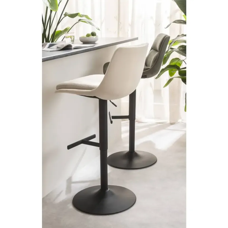 Barkruk Jens is een tijdloze barkruk die mooi aansluit in jouw interieur. De kruk is aan de binnenkant bekleed met een heerlijke stof in een beige kleur en aan de buitenkant is hij bekleed met een velvet stof. Hij staat stevig op een verstelbare poot van zwart metaal en is verstelbaar naar verschillende hoogtes. Door het hoog zitcomfort van deze barkruk kun je uren zitten aan je bar of kookeiland. Door de zachte stof en de neutrale kleur, past Jens perfect in ieder interieur.