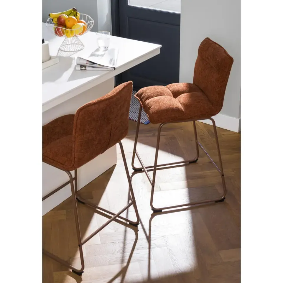 Met barkruk Stella haal je helemaal de trend van nu in huis! De kruk bestaat uit zowel een terracottakleurige zitting als terracottakleurige, stalen frame. Stella is een prachtige toevoeging aan je interieur. Door de gebolde zit- en rugkussens zit je heerlijk comfortabel. Met zijn opvallende ontwerp is barkruk Stella een echte eyecatcher!