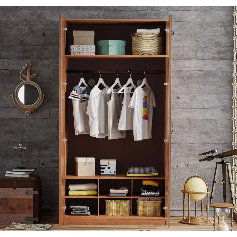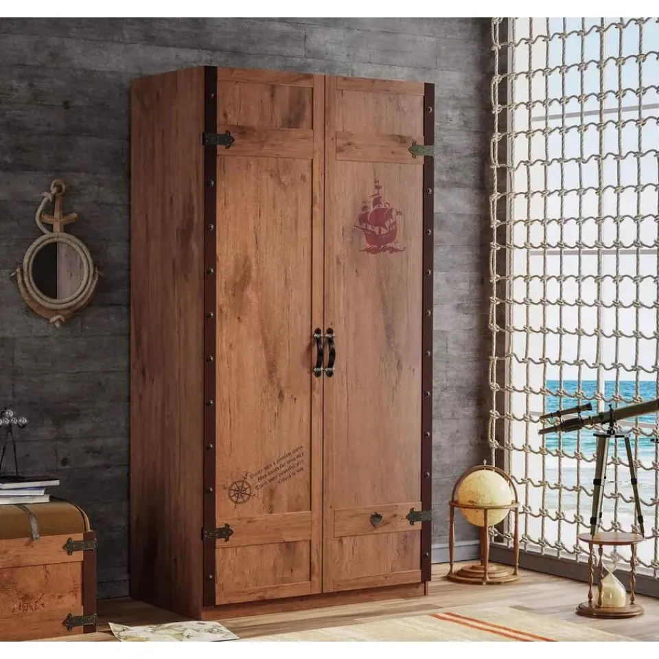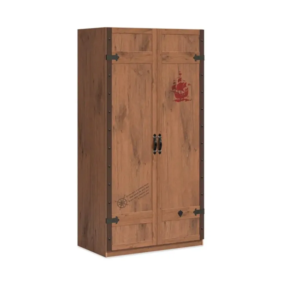 De Black Pirate 2-deurs kledingkast is een stoere en luxe kast uit de piraten themakamer. De kast is afgewerkt met een robuuste gebrande hout look en voorzien van coole piratenprenten. Dankzij het hoogwaardige ontwerp en het softclose systeem is deze kast niet alleen functioneel maar ook een echte eyecatcher in de kinderkamer.