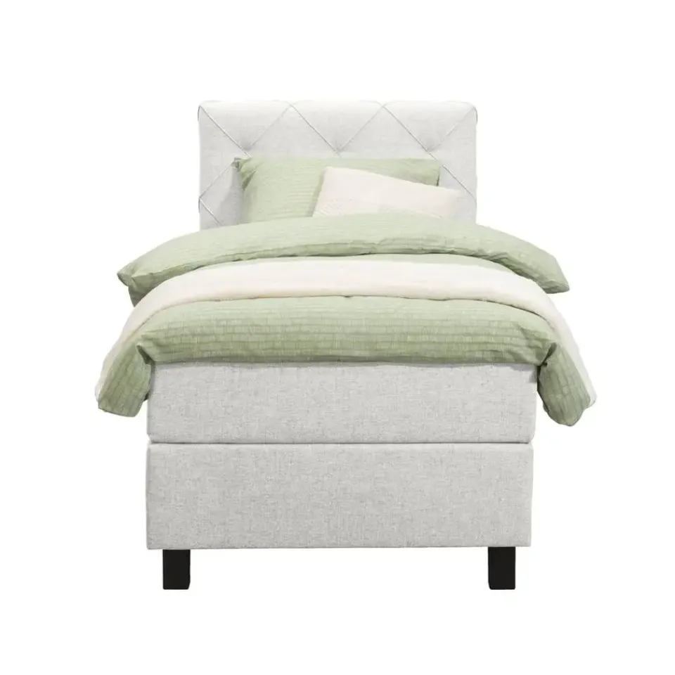 Boxspring Liv is een boxspring met een afmeting van 90×200 cm. Deze prachtige boxspring is bekleed met een fijn geweven ecru stof en heeft een romantische uitstraling met een geruit hoofdbord. De Liv geruit is uitgerust met een pocketveringmatras en daarnaast ook nog een koudschuim topdekmatras voor extra comfort. Het pocketveringmatras is omkeerbaar, bestaande uit zowel een medium- als een stevige kant. Hierdoor kun je zelf kiezen wat voor jou het meest comfortabel ligt.