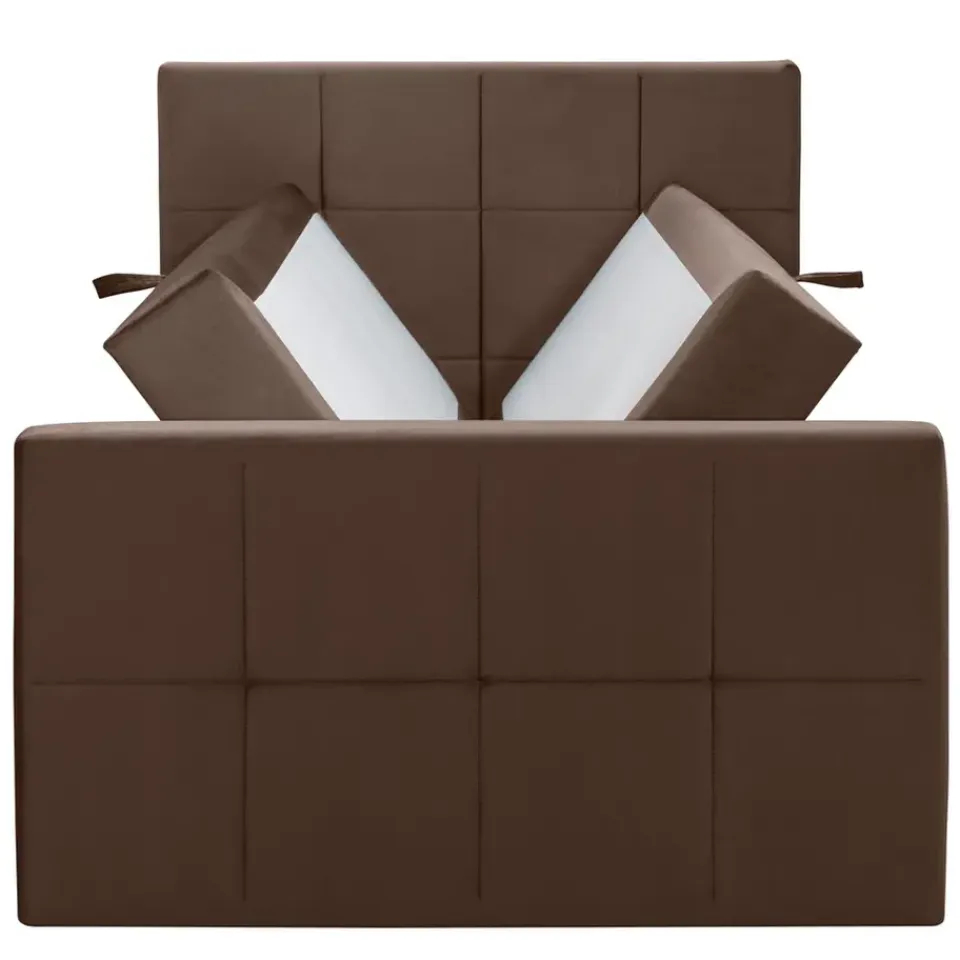 Boxspring met opbergruimte Liv is een boxspring met een afmeting van 120×200 cm. Deze prachtige boxspring is bekleed met een velvet bruine stof en heeft een landelijke uitstraling met een geblokt hoofd- en voetbord. De Liv geblokt is uitgerust met een pocketveringmatras en daarnaast ook nog een koudschuim topdekmatras voor extra comfort. Het pocketveringmatras is omkeerbaar, bestaande uit zowel een medium- als een stevige kant. Hierdoor kun je zelf kiezen wat voor jou het meest comfortabel ligt.