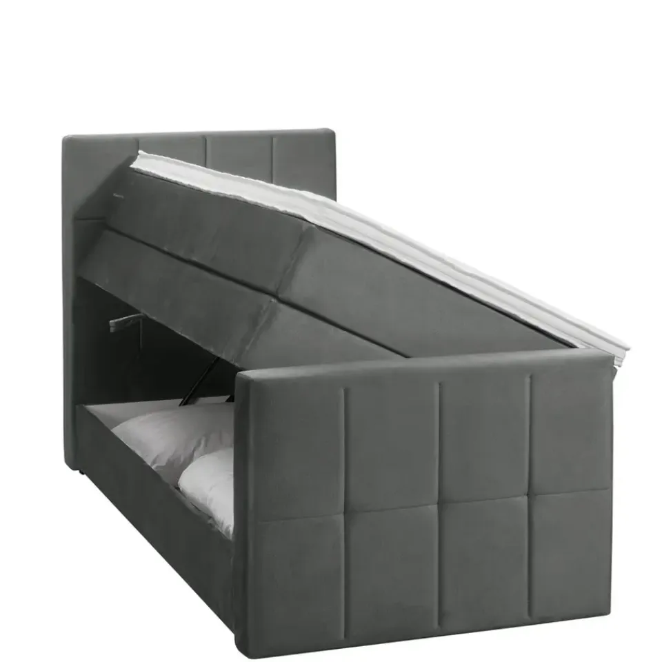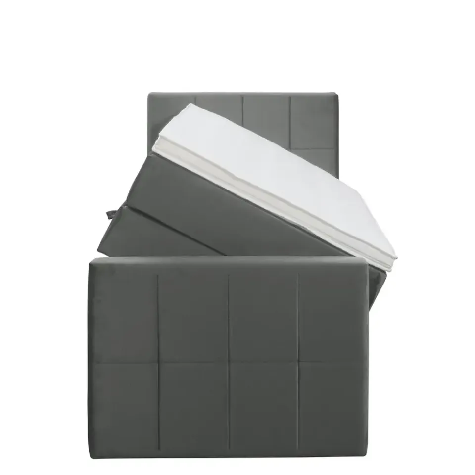 Boxspring met opbergruimte Liv is een boxspring met een afmeting van 90×200 cm. Deze prachtige boxspring is bekleed met een velvet grijze stof en heeft een landelijke uitstraling met een geblokt hoofd- en voetbord. De Liv geblokt is uitgerust met een pocketveringmatras en daarnaast ook nog een koudschuim topdekmatras voor extra comfort. Het pocketveringmatras is omkeerbaar, bestaande uit zowel een medium- als een stevige kant. Hierdoor kun je zelf kiezen wat voor jou het meest comfortabel ligt.