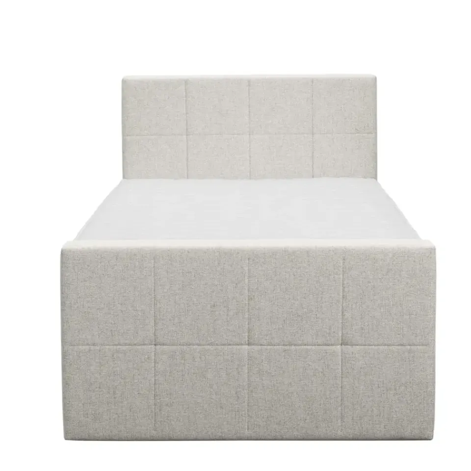 Boxspring Liv is een boxspring met een afmeting van 120×200 cm. Deze prachtige boxspring is bekleed met een fijn geweven ecru stof en heeft een landelijke uitstraling met een geblokt hoofd- en voetbord. De Liv geblokt is uitgerust met een pocketveringmatras en daarnaast ook nog een koudschuim topdekmatras voor extra comfort. Het pocketveringmatras is omkeerbaar, bestaande uit zowel een medium- als een stevige kant. Hierdoor kun je zelf kiezen wat voor jou het meest comfortabel ligt.