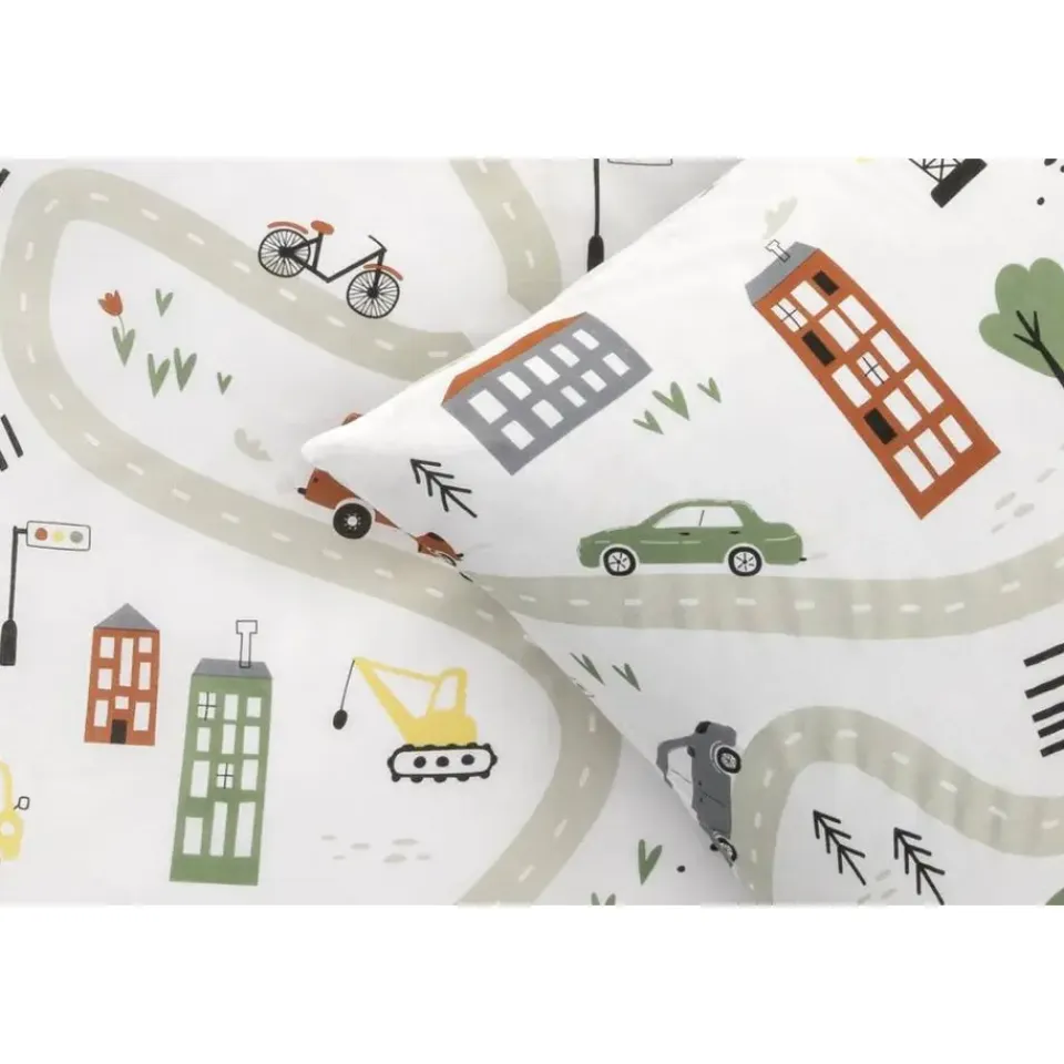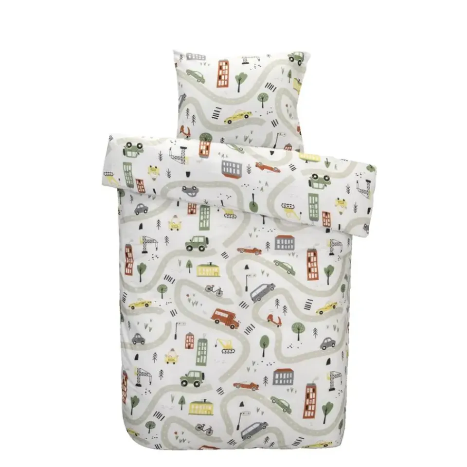 Dekbedovertrek Luuk heeft een auto/wegen thema en een afmeting van 140×200 cm. Het dekbedovertrek is gemaakt van katoen en heeft een flessenhals instopstrook.