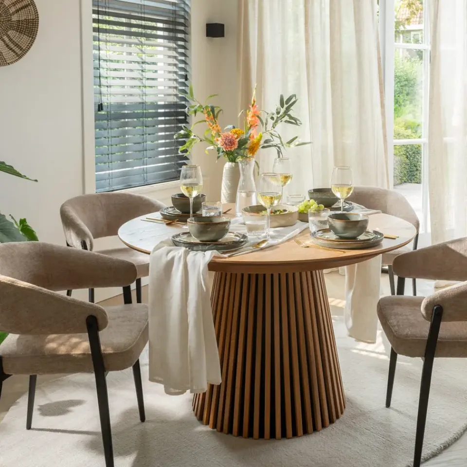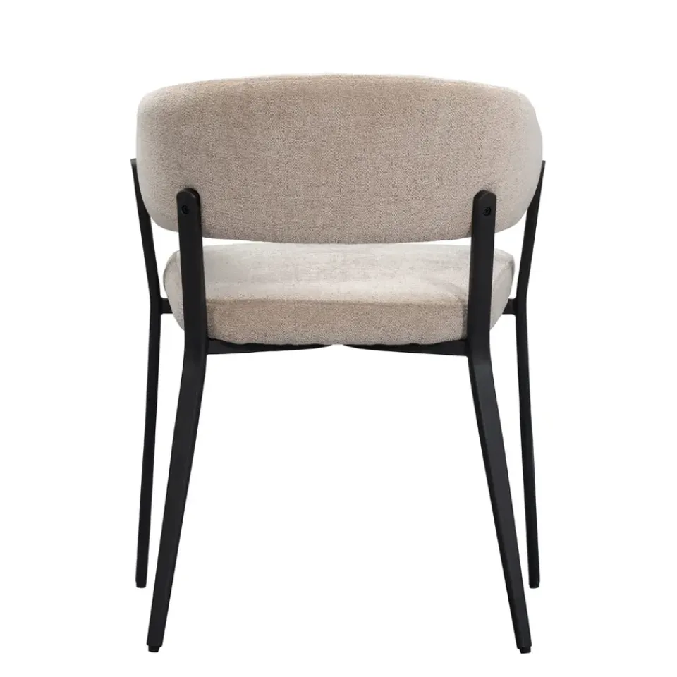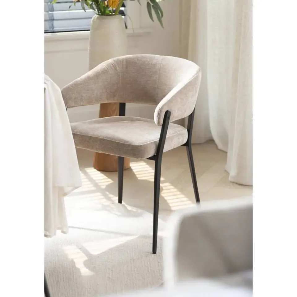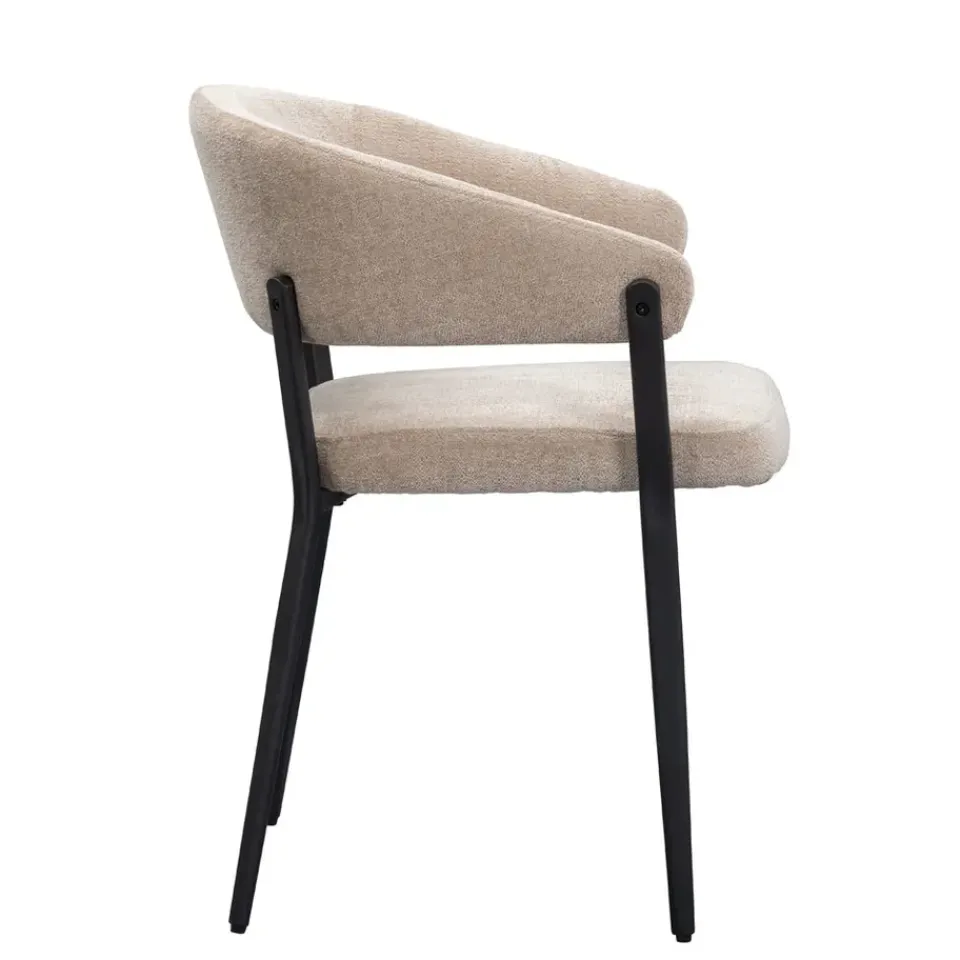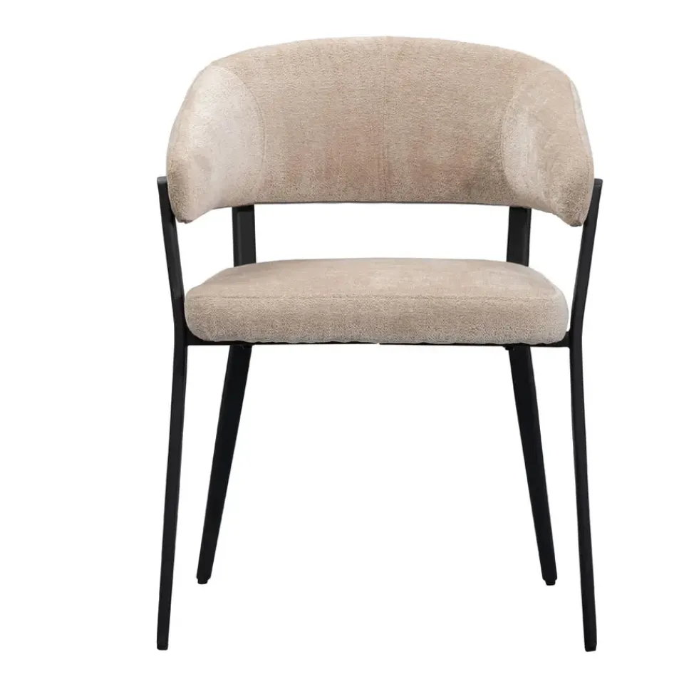 Wanneer je op zoek bent naar een moderne eetkamerstoel, dan is Eetkamerstoel Liv perfect voor jou. Met haar caramel kleurige bekleding en zwarte metalen poten past deze stoel in ieder interieur. Liv heeft ronde vormen en een open rugleuning waardoor de stoel een frisse uitstaling krijgt. De metalen poten en zachte bekleding geven de stoel een trendy look en door de comfortabele armleuningen kun je uren tafelen. Makkelijk onder te tafel te schuiven en verkijgbaar in verschillende kleuren.