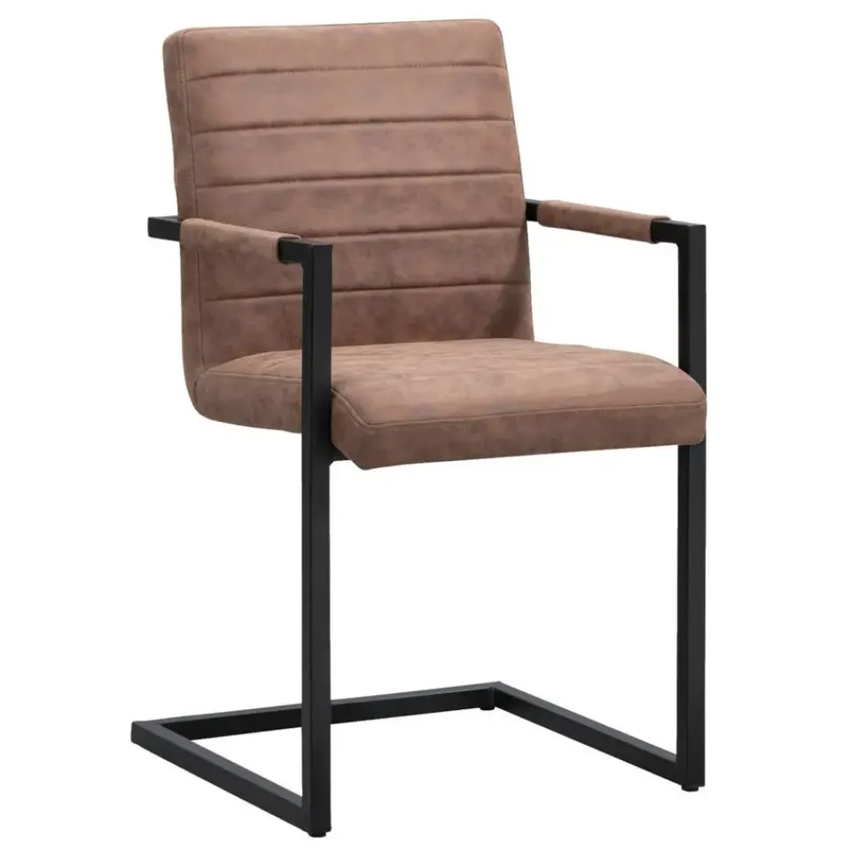Eetkamerstoel Lizzy is bekleed met een cognackleurige stof die door de stiksels ook fraai oogt. Deze stoel is voorzien van comfortabele armleuningen, die ook zijn bekleed met dezelfde stof. Wil je je armen laten rusten tijdens het (na)tafelen, dan zijn stoelen met armleuning ideaal voor jou. Ook als je werkt aan je eetkamertafel is het prettig om je armen te ondersteunen. Het metalen slede onderstel zorgt voor een licht verende zitting. Extra comfortabel dus.